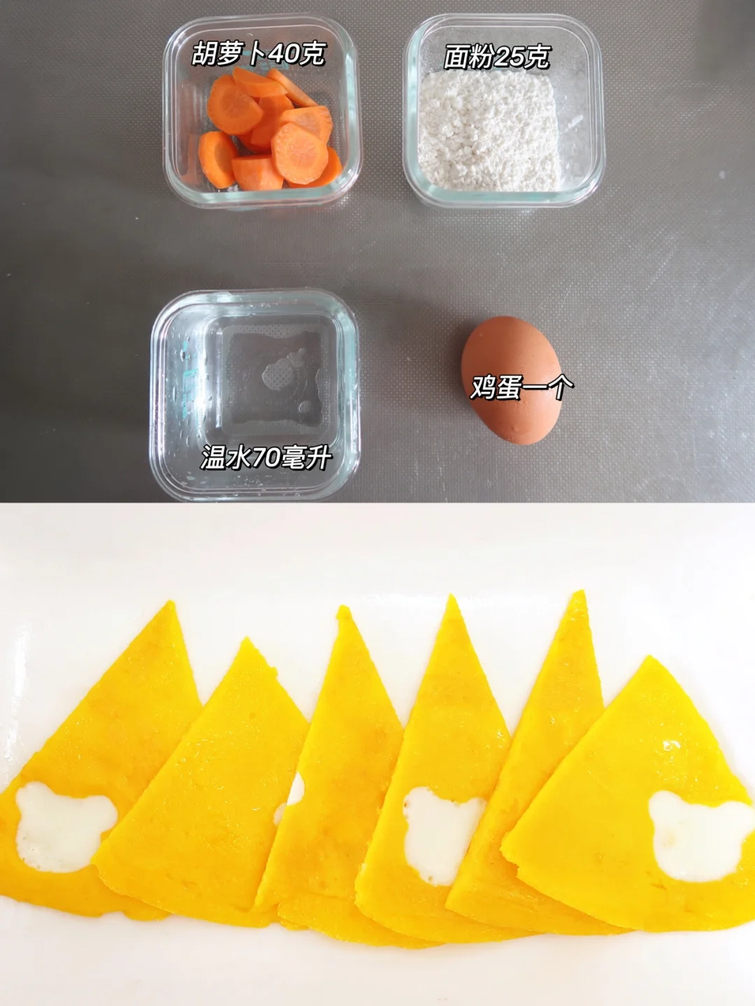 食材:胡萝卜40克,面粉25克,温水70毫升,鸡蛋一个
