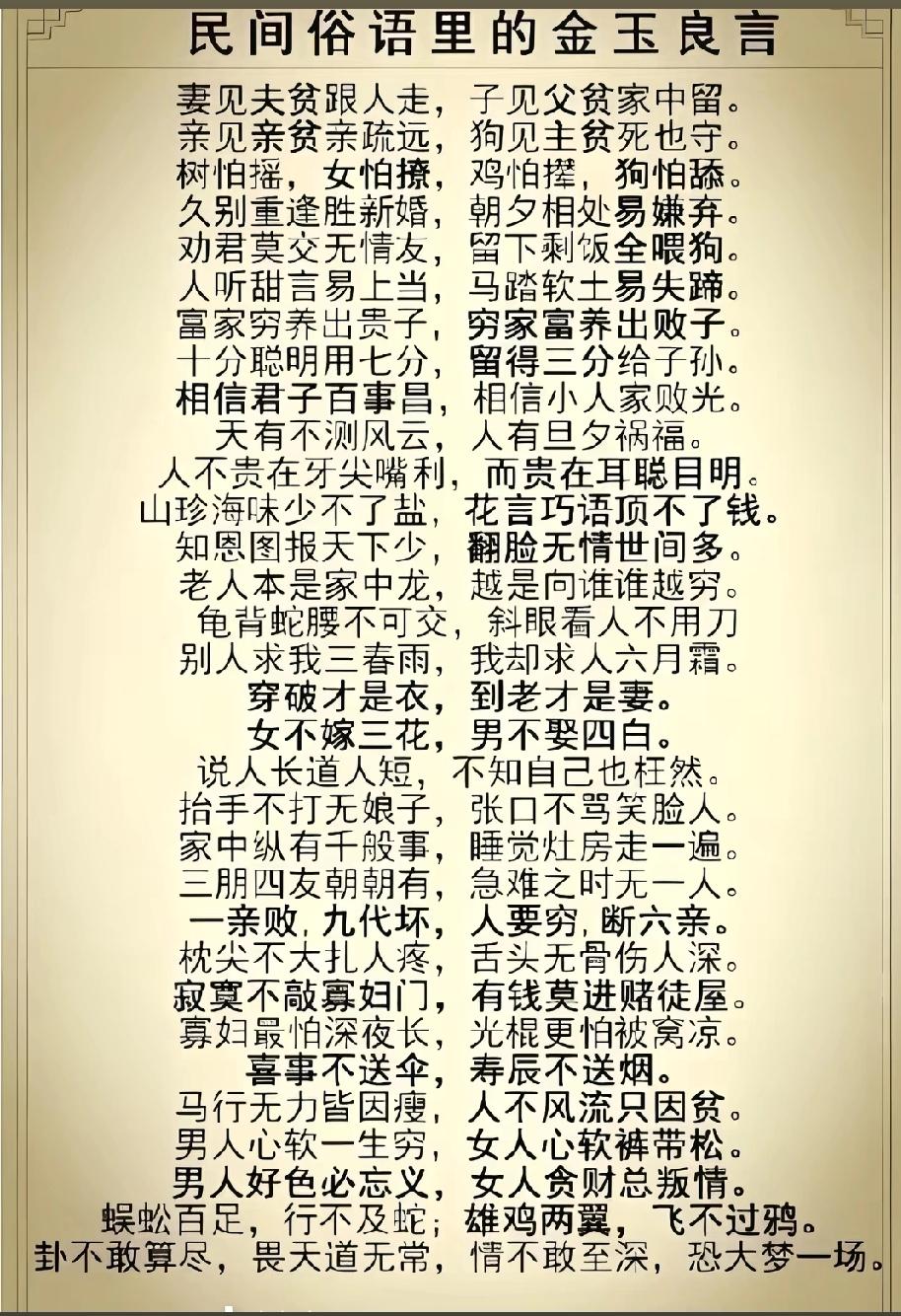 :) 树怕摇,女怕撩,鸡怕撵,狗怕舔蜈蚣百足,行不及蛇; 雄鸡两翼,飞不 过鸦。卦不敢算尽,畏天道无常,情不 敢至深 恐大梦一场。老人没钱有苦难言,女人没钱色鬼支援,男人没钱没人可怜,小孩没钱盼着过年,丑女没钱开始美颜。头无油,脚无汗,到老也是穷光 蛋。星星之火可以燎原,夹着尾巴做人,一人不进庙,二人不看井,三人不抱树,独坐莫凭栏。”民间俗语里的金玉良言,古人抛砖引玉,今人只见青砖不见玉。 常言道“忠言逆耳良药苦口利于病,不听老人言,吃亏在眼前。 ”老人摔过很多跤,告诉你哪里有坑!至于你踩不踩,是你的选择问题。还有一句俗语:吃亏是福!建议合起来理解。时代变化太快了,我们是新时代的第一批原住民。只有当进步放缓,我们成为老人的时候,才能给新来的年轻人再次提起,不听老人言,吃亏在眼前。