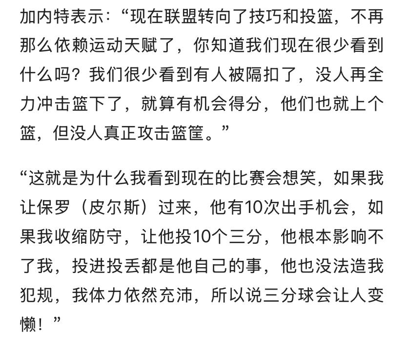加内特说3分让人变懒,隔扣变少——我有证据! 对比每日10佳球,发现没拉杆消失了。以前这可是每队招牌明星后卫所必需的。 现在高难度上篮都不见了,就别说隔扣这些了,多费事啊,扔3分就完了。 最关键的角色球员技巧和投射提升,让进攻更平均需防守人更多,超巨们也就不需要这些高难度得分方式了!