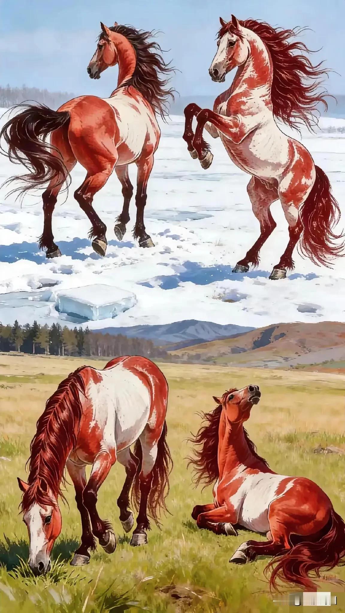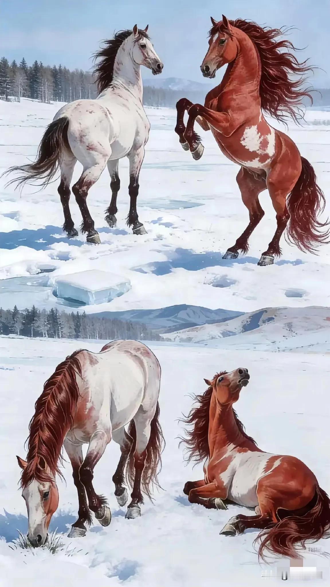 两只骆驼在雪地里吃草,树枝上挂满了冰。
