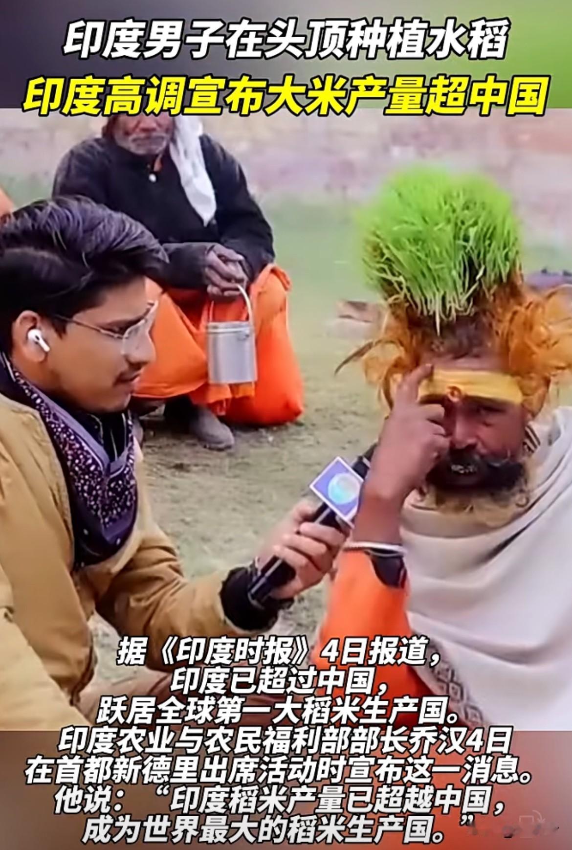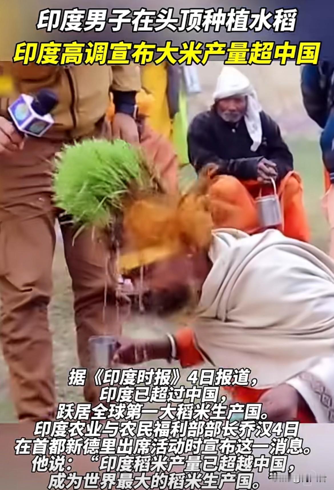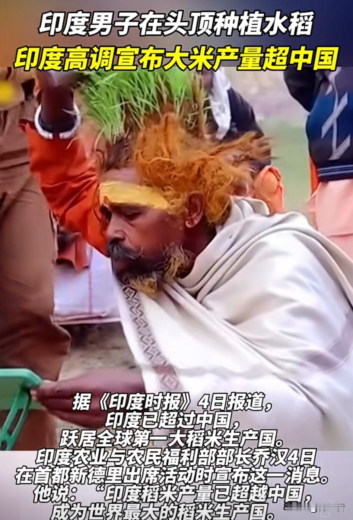 四十多年头顶种水稻,足足108株,为了养这些稻子,四十多年不洗头,还定期撒粪肥,这是早年酒驾失亲后苦修赎罪,还想激励乡亲重视种粮。印度政府宣布2025年大米产量超中国成全球第一。产量达约1.5亿吨,超中国的约1.45亿吨。不过,这只是年度总产量第一。印度水稻种植面积约4400万公顷,远大于中国的2900多万公顷。而且2025年天气好,印度农业靠天吃饭。所以,这产量第一更多是量的堆叠,并非质的领先。