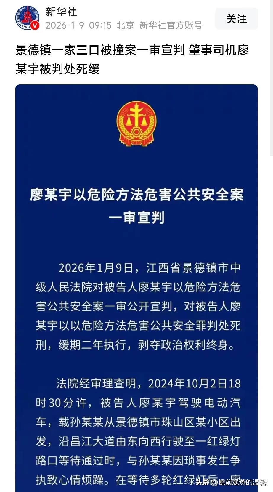 我不明白三条人命摆在那里还有什么可审的,廖某宇是什么无辜的人吗?拖了一年多才判死缓,缓刑两年给他拖延时间后续来搞一下个保外就医逃到国外逍遥等事情过了再回来,想想就很气。 想想抱着没满周岁宝宝的胡某两口子,刚要过马路,直接被撞飞。三条人命,当场没了。 这场悲剧发生在2024年国庆假期的晚高峰,事发路段是城市主干道,限速仅40km/h,廖某宇却因车内与人争执心情烦躁,驾车超速至近130km/h疾驰,径直撞上了正要过马路的胡某一家。未满周岁的婴儿尚在父母怀中,一家三口还没来得及感受更多人间温暖,便在瞬间阴阳相隔,这般惨烈的场景,任谁听闻都会心生悲痛,这也是公众对判决结果难以释怀的核心原因。 从案发被刑拘到一审宣判,案件历时一年多,最终法院以以危险方法危害公共安全罪,判处廖某宇死刑缓期二年执行。很多人不解判决结果,实则法院审理有明确考量:廖某宇虽造成三人死亡的严重后果,但案发后第一时间拨打急救和报警电话,在现场等候处理构成自首,且看见被害人时曾紧急制动、避让,其主观心态为间接故意,与蓄意危害公共安全的行为存在区别,因此作出该判决,被害人家属对此结果不认可,已明确准备申请检察院抗诉。 不少人担心廖某宇会借缓刑期钻保外就医的空子,甚至借机逃避惩罚,这份顾虑可以理解,但从法律层面来看,保外就医的门槛十分严苛。按照规定,罪犯需患有省级政府指定医院确诊的严重疾病,且无社会危险性,经层层审批后方可获批,绝非个人能随意操作,更不存在借机逃至国外的可能,法律对这类重罪罪犯的监管本就更为严格。 一年多的等待,对被害人家属而言是煎熬,他们执着于死刑立即执行的诉求,不过是想为逝去的亲人讨一份公道,想让漠视生命的肇事者付出应有的代价。而公众的气愤,本质是对生命的敬畏,是对“敬畏法律、珍视生命”的朴素期待——每个人都希望,马路上的危险驾驶能被严厉震慑,无辜者的生命能被法律牢牢守护。 案件的争议,本质是法律条文适用与社会公序良俗认知的碰撞,司法判决既要坚守法律底线,也需回应公众对公平正义的期待。廖某宇的判决不是终点,后续的抗诉程序仍在推进,法律终将给出最公正的定论。 各位读者你们怎么看?欢迎在评论区讨论。廖某宇