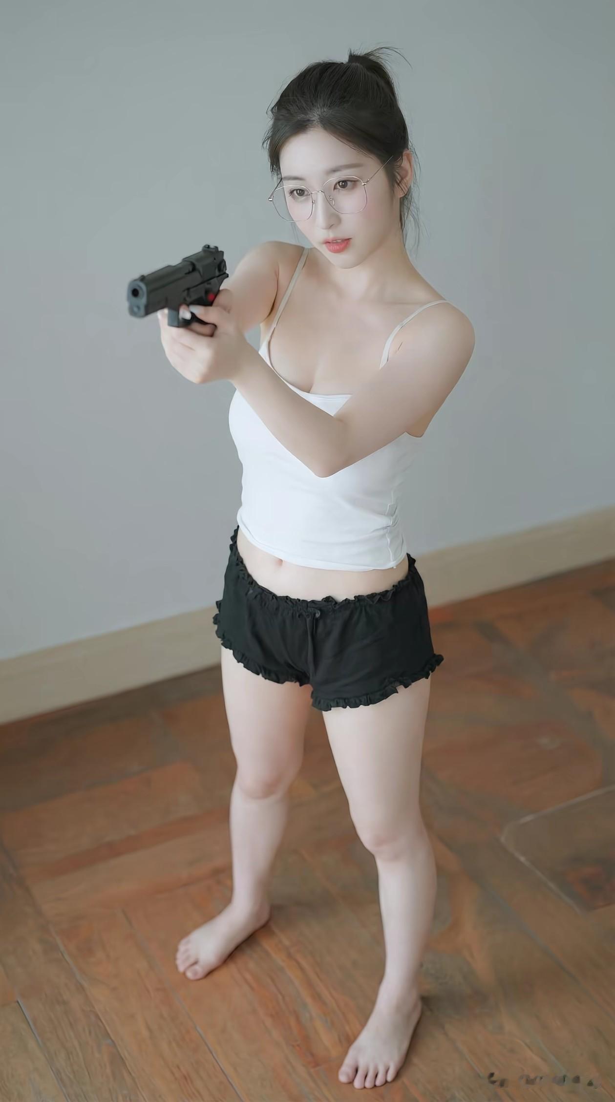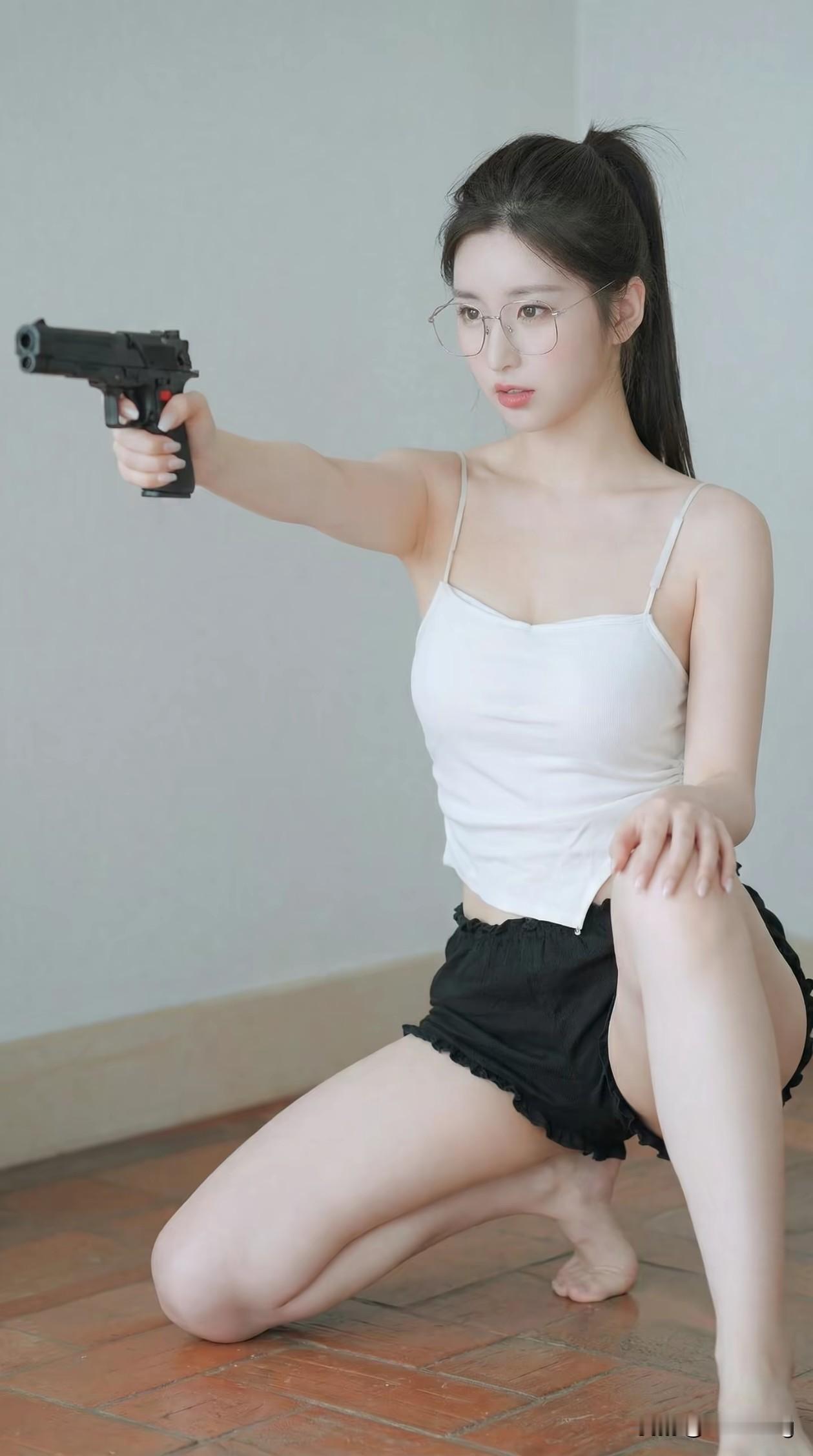 酷飒与柔美并存,当利落马尾搭配简约背心短裤,手持道具枪的瞬间,仿佛化身神秘特工。眼神中的坚定与自信,在光影下尽显独特魅力,诠释别样的时尚态度。