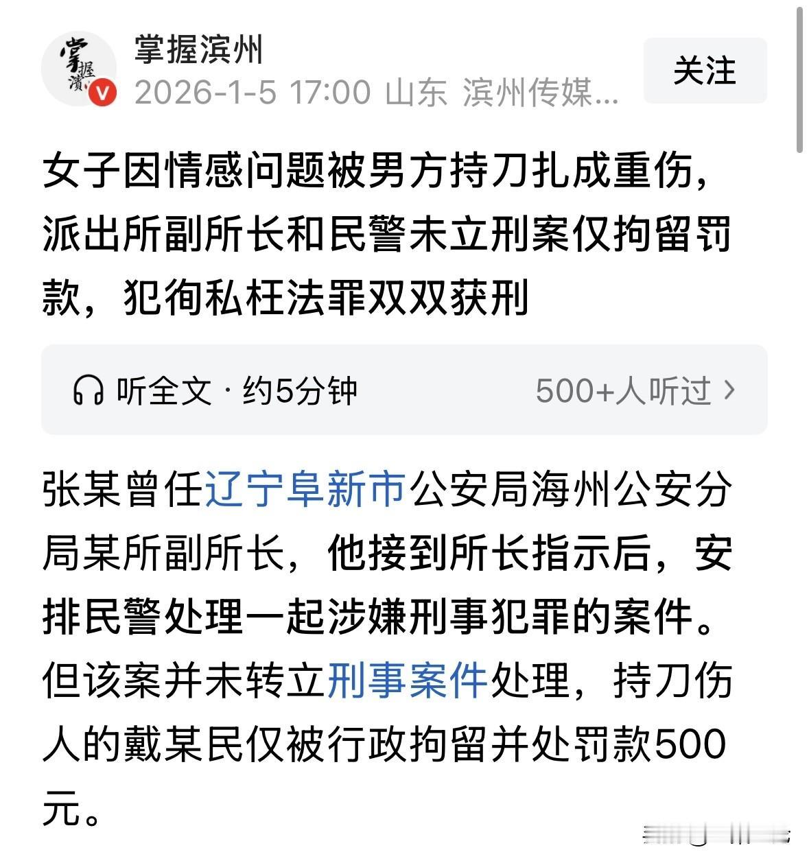 辽宁阜新,女子和男友争吵时,被对方持刀扎成重伤,男子哥哥知道事情大了,就给私下交好的所长朋友交代一番,让高抬贵手,放弟弟一马,所长答应了,嘱咐下面俩民警大事化小,把刑事案立成治安案件,俩民警照办,最后男子只被拘留10天、罚款500块。原以为事情被掩盖过去了,谁料7年过去,案子竟又被翻了出来,这下当年那几个相关人傻眼了。 2017年10月一个晚上,戴某民因为感情纠纷跟女友张某娟吵翻了天。 冲动之下,他掏出刀子就把女方给捅了。 这可不是小打小闹,张某娟当时就被拉到医院抢救,诊断结果吓人:胸被刺穿了,肾也被扎透了,肋骨断了好几根。 这伤情,明眼人一看就知道不轻。 出了这么大的事,戴某民的哥哥慌了神。他没让弟弟去自首,而是动用了关系,转头去找了派出所所长赵某甲。 哥哥开门见山,说都是兄弟,给个面子,高抬贵手。 赵某甲还真就应了这事,转头就把时任副所长的张某叫来,点了一嘴,说这是我朋友的事,你看着办。要是对方不追究,就按治安案件处理,别往大了整。 张某这时候心里咋想的?估计也是忐忑的很。他知道这伤得不轻,搞不好是刑事犯罪,但面对顶头上司打的招呼,他不敢不听,也不想得罪人。 于是,这道歪嘴命令就这么传下去了。 张某指示手下民警赵某和刘某,说把这案子立成治安案件,别往上捅了。 赵某接到命令,心里其实跟明镜似的。他干警察这行,能不知道那伤口大概率够得上轻伤甚至更重? 这要是放别人身上,早就该刑拘、走程序了。可现在是领导发话,同事张某盯着,他选择了装糊涂。 接下来的操作,简直就是走过场。赵某和刘某就给戴某民和一个证人做了笔录,其他啥也没干。 按规矩,得开委托书让受害者做法医鉴定,他们没开,得告诉受害者有权鉴定,他们也没说。 他们就这么稀里糊涂地,把一起故意伤害案硬生生按成了“打架斗殴”,最后只给了戴某民拘留10天、罚款500块的处罚。 最离谱的是为了让这事合法结案,派出所还搞了个声明,大概意思是:我们不要求处理了,也不追究责任,案子撤了吧。 刚从鬼门关回来的张某娟,就在这种半哄半骗的氛围里签了字。 但这事没完。到了2024年,也就是7年后,这旧账又被翻出来了。 经过正式鉴定,张某娟那伤哪是轻伤?膈肌破了、脾切了、胰尾也伤了、左肾还补了,4个地方都是重伤二级! 这下纸包不住火了,戴某民很快被抓,法院判了他5年半有期徒刑。 戴某民进去了,那当年帮他平事的人,也就是张某和赵某,自然也被推上了被告席。 法庭上,张某还觉得委屈得很,说我又没拿戴某民一分钱,我是听领导的话啊! 但法律面前,可不管这些。 你们虽然没直接收黑钱,但你们为了照顾领导的面子,明知这是犯罪,却故意不追查、不鉴定、压着不办,这就是徇私枉法。 你们怕得罪领导、怕影响自己前途,就无视法律? 虽然张某和赵某在这起案子里是听喝的,算从犯,而且张某是电话传唤去的,赵某是自首,俩人都认罚,但法律底线不能破。 《刑法》第399条第1款规定:司法工作人员徇私枉法、徇情枉法,对明知是无罪的人而使他受追诉、对明知是有罪的人而故意包庇不使他受追诉,或者在刑事审判活动中故意违背事实和法律作枉法裁判的,处五年以下有期徒刑或者拘役;情节严重的,处五年以上十年以下有期徒刑;情节特别严重的,处十年以上有期徒刑。 张某和赵某虽然没拿戴某民家属的一分钱,但他们面对所长赵某甲的“招呼”,因为怕得罪领导、怕影响自己前途,就选择了无原则服从。 这种“屈从私情、违背职责”的心理状态,在法律上就被定性为“徇私”。 法律的逻辑是:你是执法者,你的唯一上级是法律,而不是所长。当领导的指示明显违法时,你选择了听领导的而不是听法律的,你就已经在“枉法”了。 构成这个罪的关键是“明知”。作为干了多年的老警察,看到受害人被扎成重伤,但他们为了把案子“按死”在治安层面,故意不开鉴定委托书,故意不告知受害人权利,甚至诱导受害人签“不追究责任”的声明。 这种揣着明白装糊涂的行为,在刑法上就被视为明知是有罪的人而故意包庇。 你是专业人士,你有义务去查明真相,你故意不查,就是包庇。 只要你当时实施了利用职权阻断刑事追诉的行为,犯罪就已经既遂了。至于后来案子翻出来凶手被抓,那是另一回事,不能洗白你当年的渎职行为。 最后,一审判决张某判刑2年7个月,赵某判刑1年5个月缓刑2年。 张某不服,觉得判重了,又上诉,结果二审直接驳回:维持原判。 咱们常说有困难找警察可要是这警察为了帮领导平事,把黑的说成白的,那这事情可就变了。 就像这俩民警,为了听领导的话,硬是把一起拿刀捅人的恶性案件给大事化小,结果不仅受害者遭了罪,他俩自己也把警服换成了囚服,真是唏嘘呀! 对于这件事,你怎么看? 欢迎关注@一案一论