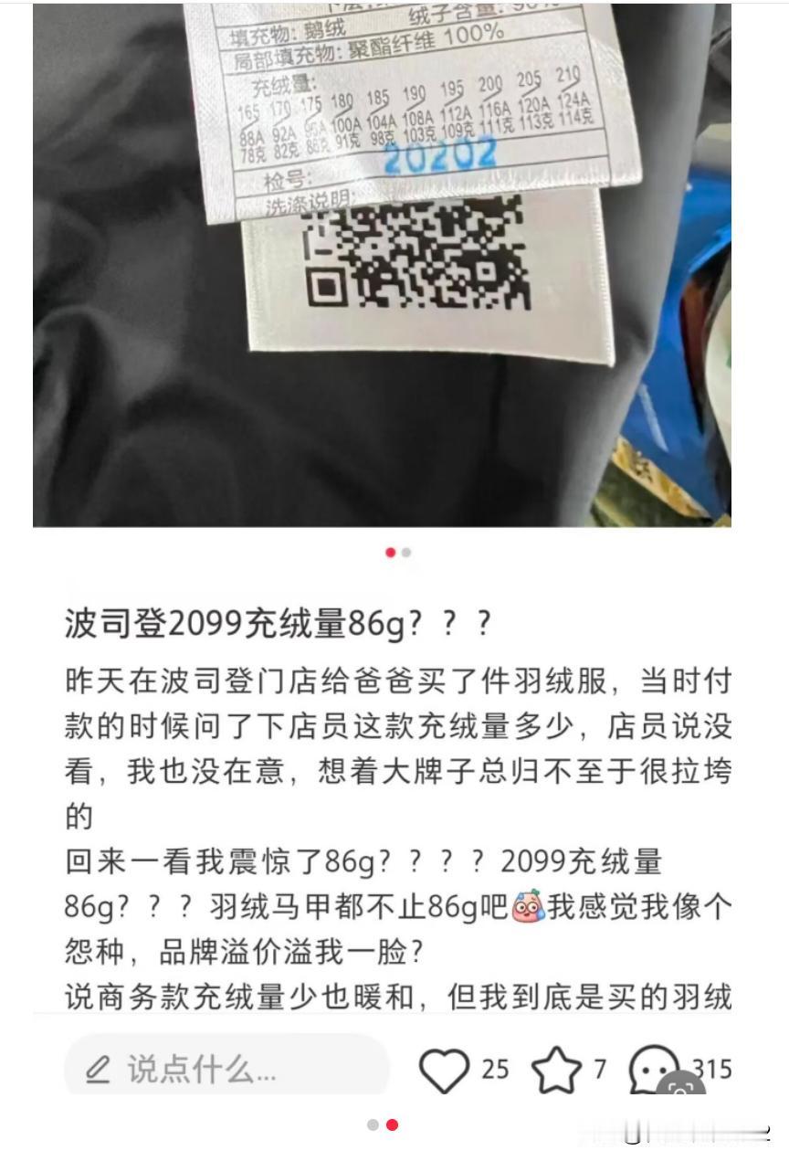 2299元羽绒服充绒量仅86克?波司登回应了 日前,有江苏网友在社交平台发文称,波司登门店一款售价2099元的羽绒服,充绒量只有86克,质疑其品牌溢价过高。此事引发大量关注。 1月9日,界面新闻根据网友照片中的水洗标货号,在第三方购物平台波司登自营旗舰店查询获悉,该产品为2025年男士商务系列鹅绒羽绒服,蓬松度超过700,为加厚、短款,可脱卸内胆,绒子含量达90%。不同尺寸的含绒量不同,其中175尺码充绒量确为86克,180尺寸充绒量为91克。该款羽绒服原价2299元,优惠后价格为1999元,目前已售2000多单。 针对网友对其品牌溢价的质疑,1月9日,界面新闻致电波司登官方客服,对方表示,波司登的充绒量符合国家标准,而价格的高低不仅取决于充绒量,还包括许多综合性因素。