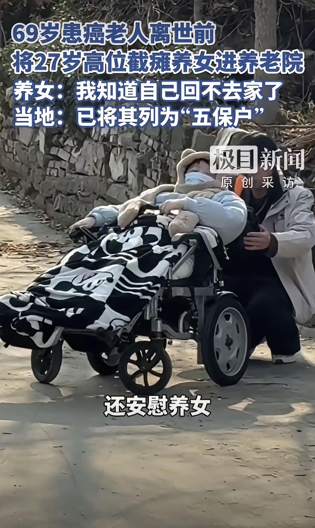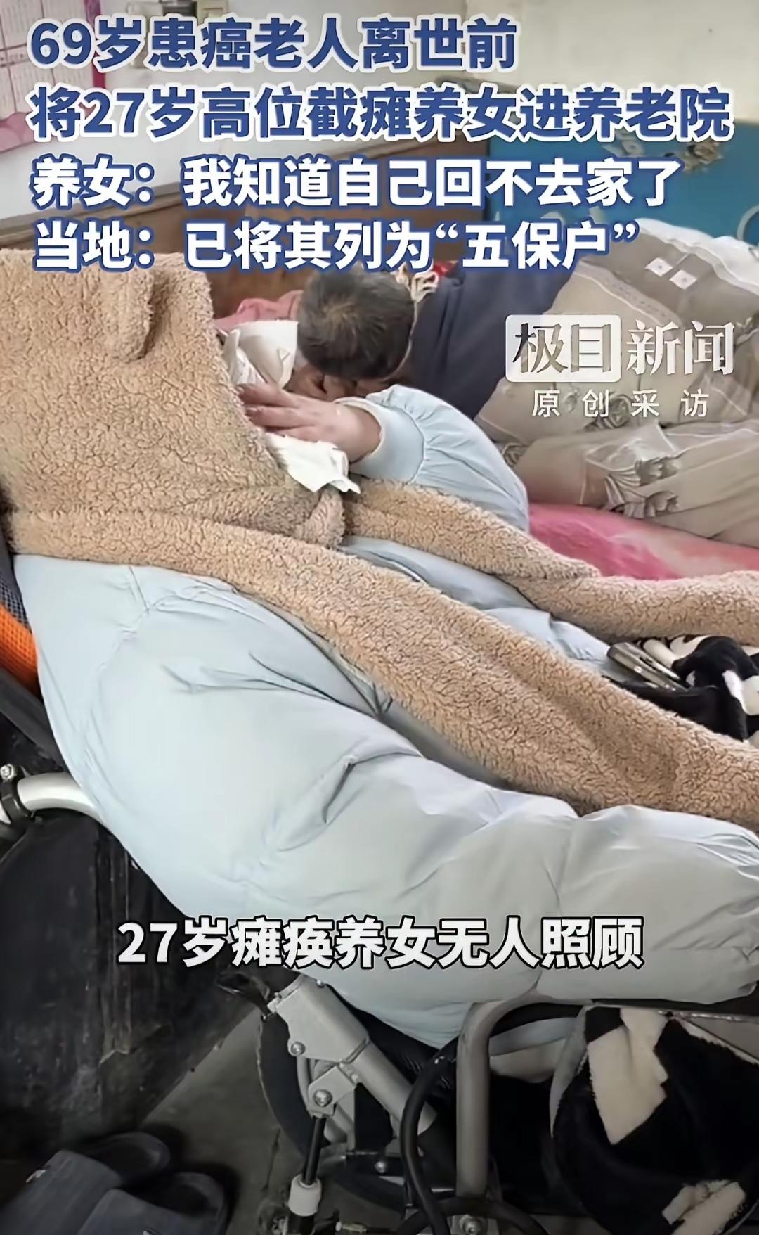 麻绳真的是专门在细处断,徐大爷69岁患癌多年,知道了自己要不行了,临终前他不不下自己高位截瘫27岁养女,把她送到养老院,并嘱咐养女不用担心自己去做个手术,很快就把她接回来,养女等了几天知道他父亲去世了,悲痛欲绝,现在已经没有亲人了,当地政府把她列入五保户,可以安心住在养老院了,徐大爷在天堂里边也放心了。