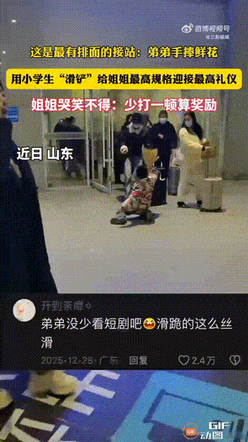 山东一名女子带着儿子去接机,因为她的女儿就要回来了,她让儿子手捧鲜花,到时候见到姐姐,就交到姐姐的手里。 谁料儿子一见到姐姐,居然以一个“跪滑”的姿势来迎接,然后再把鲜花送给了姐姐。 周围的群众见状都震惊不已,姐姐却感到又好气又好笑,调侃道,“少打一顿就算奖励了”。 网友看完这一幕,都觉得这个男孩的做法实在是太搞笑了。 别人去接机,都是非常感动的画面,比如一个拥抱,或是一个亲吻,但他却用“跪滑”的姿势给了姐姐一个惊喜,真是人小鬼大啊,相信他也是比较调皮的性格。 不过只要是不危险,这样的动作还是蛮有趣的,让人有眼前一亮的感觉,虽然姐姐表面调侃,但想必心里也是很感动的。 不得不说,这家人的家庭氛围非常不错,如果不是感情很亲密的话,想必不会特意去接机,也不会这么用心地想好迎接姿势,也是很让人羡慕了。大家怎么看呢?