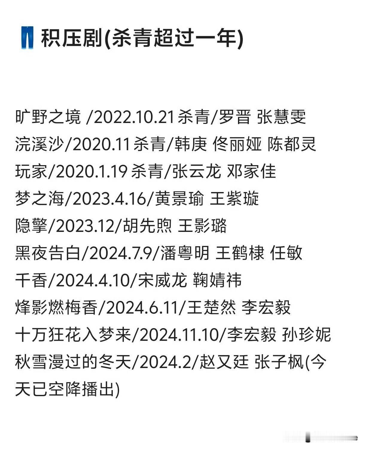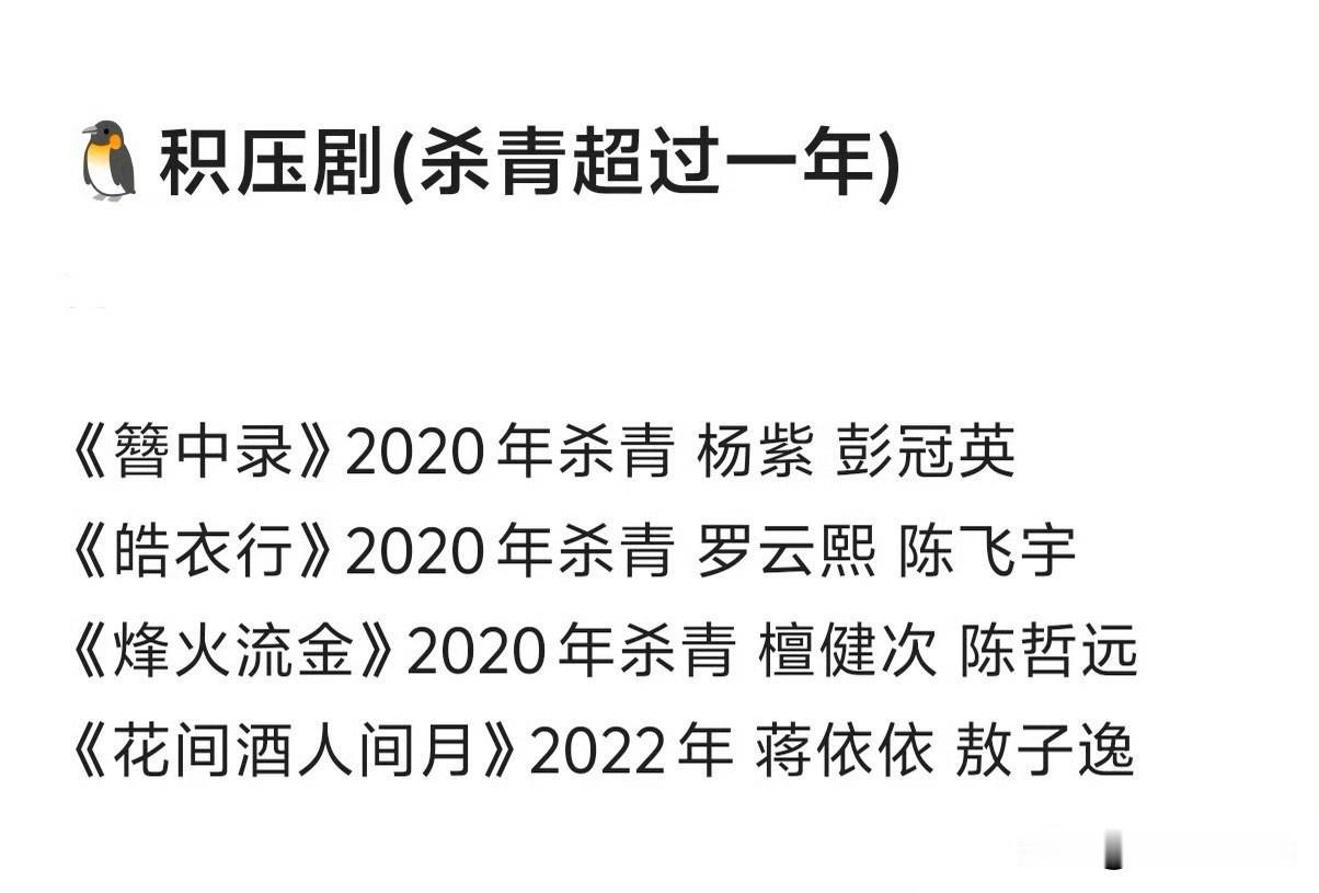 1月10日,三大压剧(杀青超过一年)盘点,网友看完心疼🥝,因为它压的剧最多 有些剧一看就很难再播出了,有些剧有希望播出,但艺人可能都不希望它播出了,毕竟几年前拍的剧,服化道剧情可能都跟不上现在观众的审美与喜好了,以其播一部旧剧,不如多拍一部新剧,还能避免被观众蛐蛐 发现《陈情令》之后出了不少类似题材剧,我记得没错的话,只有龚俊那部跟胡一天张云龙那两部播出了,后面再也没有类似剧播出了,内娱偶尔也有拍,但播没看见…… 青簪行去年杨紫都写进了待播剧卡片,结果还是没播,如今一连三部新剧播出,对它已不抱期望了……播了就看,没播也不催不惦记 杨紫 刘亦菲