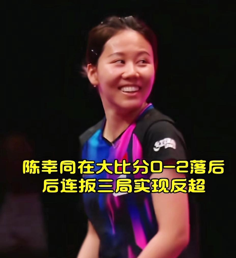 一觉醒来看到陈幸同这张笑脸, 就知道我们赢了。 在大比分0-2落后的情况下, 连扳回三局实现反超, 决胜局更是打了个17:15的爆分。 陈幸同太牛了, 她拼尽全力守住了自己的1/4区。 多哈冠军赛女单1/4决赛, 陈幸同对战张本美和。 虽然没有看直播, 但是单看比分就感觉惊心动魄的, 佩服陈幸同的坚韧顽强。 虽然看着鏖战了7局, 实则是打了八局的比分, 陈幸同这体力很是可以啊。 大迪和曼昱相继出局, 陈幸同也是支棱起来了。 一个半小时的鏖战, 最后一局爆分一分一分咬下来, 太不容易了, 扛下来就是最棒的。 陈幸同真棒, 继续加油!! (图片源自于网络) 带定位晒今日生活 我的今日状态:😁轻松愉快 我这里的天气:☀️晴天