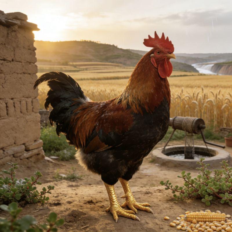 山坡羊·湖南雄鸡 南岭晨亮, 田垄霜降, 红冠金爪英姿壮。 抖星芒,破苍茫。 土坯垛上声嘹亮, 啼醒灶烟鸡梦长。 晨,唤景祥; 昏,守院祥。 啄粮欢畅, 篱边闲荡, 不羡鸿鹄田园傍。 看麻慌,守安祥。 暮归草筐听门响, 藏起农家心底望。 风,志未降; 雨,志未降。 湘鸡灵象, 不卑无亢, 担当融入声声唱。 土情长,岁华彰。 平凡日子光无量, 守着田畴歌韵扬。 声,岁月昂; 情,岁月昂。