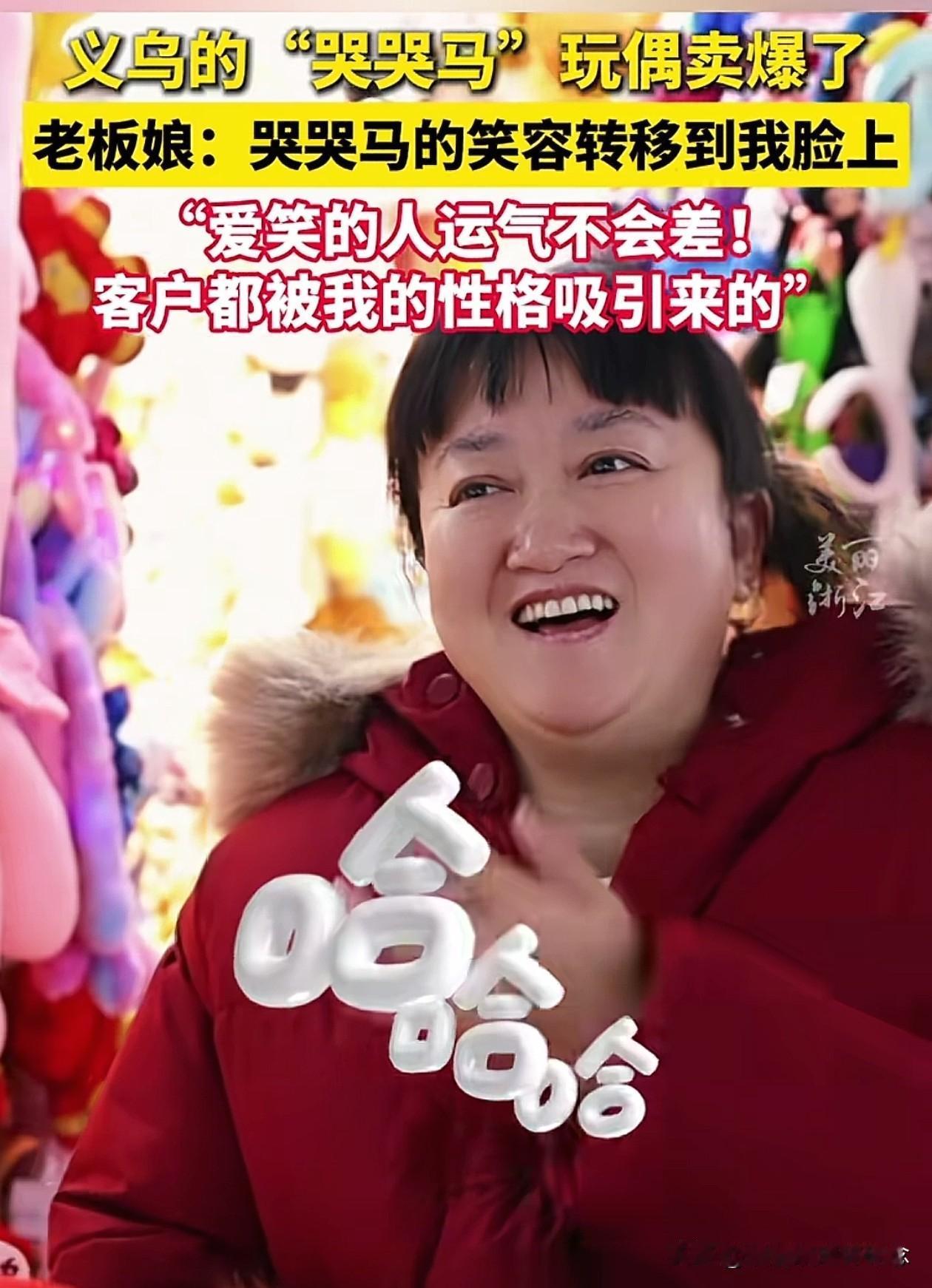 大家有没有发现, 突然爆火的“哭哭马”和老板娘长得很像?老板娘说:“我感觉我家所有产品的笑容都转移到我的脸上了。” 最近,义乌生产“哭哭马”的老板娘在接受采访时,谈到商品爆火,她抑制不住的大笑,说这是她的运,现在心情特别开心,躺着就能赚钱了。 因为工人把小马的嘴角缝反了,反而让这只小马爆火出圈,现在流水线从两条增加到十多条,也自然供不应求。 老板娘张火清更是笑得合不拢嘴,说爱笑的人运气都不会太差。网友建议应该给缝错嘴角的工人奖励,老板娘说没法找到这个人是谁,但是他们计划过年时给工人们都加奖金。 “哭哭马”爆火就是撞准了大家的“反萌差”审美!蔫蔫的委屈脸,戳中了打工牛马们想吐槽、想摆烂的情绪。再看老板娘这爽朗的笑,谁看了不乐? 你们会不会准备入手一个? “哭哭马”玩偶为何意外走红