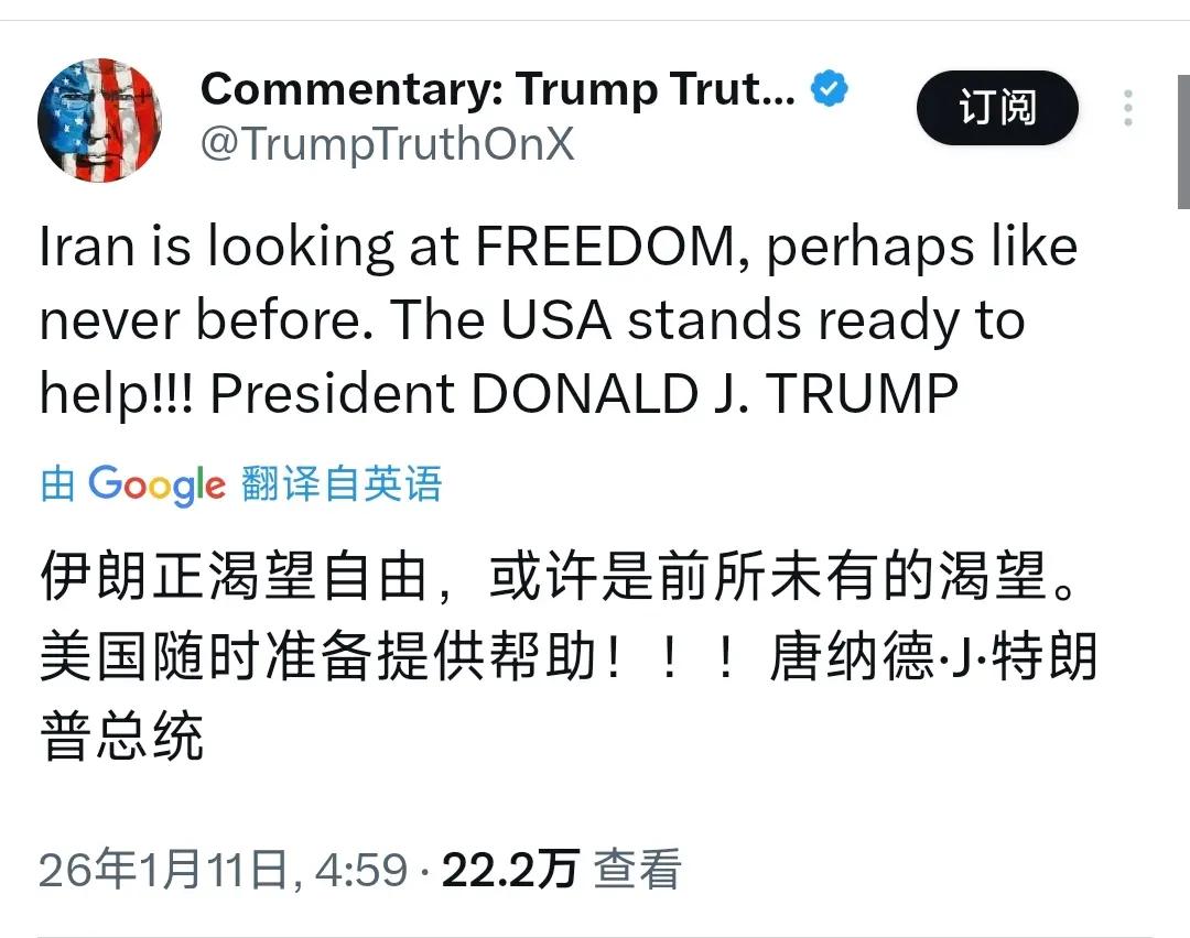 1月11日,特朗普写道:“伊朗正渴望自由,或许是前所未有的渴望,美国随时准备提供帮助!!!” [机智]特朗普隔空喊话太虚伪!美式“帮助”是掠夺灾难代名词,他这番“助伊求自由”的说辞,堪称本世纪最拙劣的谎言!1953年美策动政变推翻伊朗民选首相摩萨台,又在2020年暗杀苏莱曼尼,退出伊核协议后极限施压,让伊朗通胀飙至56%、石油出口暴跌80%,民生凋敝的苦果全是美霸权所赐! 一边喊着帮自由,一边对委军事掠夺石油,复刻伊拉克战争的资源掠夺套路;一边给伊朗民众画饼,一边用制裁扼住其经济命脉,伊朗人早看透美式帮助:来时带枪炮,走时留废墟,所谓自由不过是美掌控中东石油、搅乱地区局势的幌子,这般虚伪双标,骗得了自己骗不了世界!