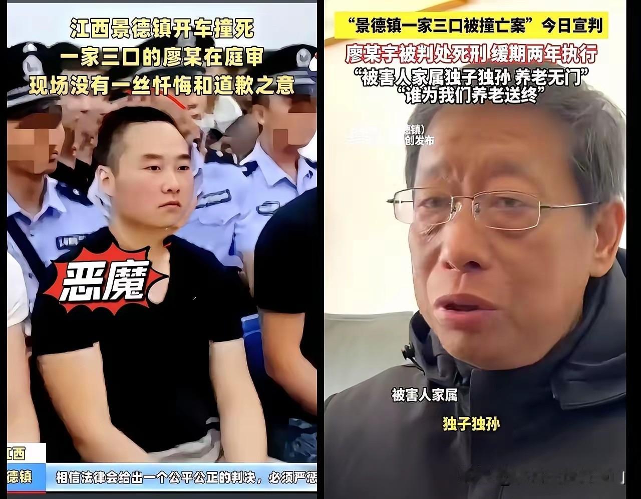 ​廖某宇在景德镇飙车128码灭了一家三口,一审判个死缓,被害人的父亲说:“廖某宇缓期执行的情况下,他应该坐牢15年,再加两年,是17年,也就是说他出狱的时候也就39岁。他还可以享受自由的空气,还可以与家人共同生活,他还能娶妻生子!而我们两个人60多岁了,独子独孙,还有我儿媳,一家三口就这样被他无辜杀害了,我们的人生在哪里,我们会孤老终生!” ​廖某宇被判死缓,这样的结果对被害人一家来讲,确实是太不公平了,毕竟人家失去了三条生命啊! 本来就是廖某宇的大错,事情发生到现在,他的父母对受害者家属不但不道歉,不慰问,不赔偿,还张扬跋扈。廖某宇在法庭上接受审判,抬着他那高高的头颅,一副自以为是的嘴脸,他根本不知道自己的行为给受害者家属造成多大的伤害。 两个年过半百的老人同时失去儿子和孙子,本来想给自己儿子讨回公道,结果因为廖某宇发生事情时有避让的举动,加上事后主动报警,打120,还主动自首,就说犯罪的心态为间接故意,而且有自首的态度,就把死刑变成死缓。这一系列操作让人疑惑,难道死了的人就算了,活着的人只要态度好点,就可以被原谅,坐个一二十年的牢还可以回来和父母团聚。 但是你看他那样子像有一点悔意和歉意吗?在法庭上都是自以为是的态度,受害者家属父亲说,他报警了在车里还和警察吵架,而是在车速上撒谎了 这算自首吗? ​他爹也是素质堪忧,自己儿子撞死了对方,还不替儿子低头认错竟,然当庭咆哮甚至还要动手打受害人律师。所幸被法警摁住,不然受害者律师都要遭殃,它爹也是坑儿子了,这一闹,把检察院彻底给“惹毛”了,直接提起抗诉! ​理由给的很直接:量刑明显不当,毫无悔改之心。 这样的廖某宇,你觉得死缓量刑适合吗?受害者的母亲知道对方是死刑,缓期两年执行,而且态度还如此嚣张时,直接怒吼,我要上诉,告到我死为止。