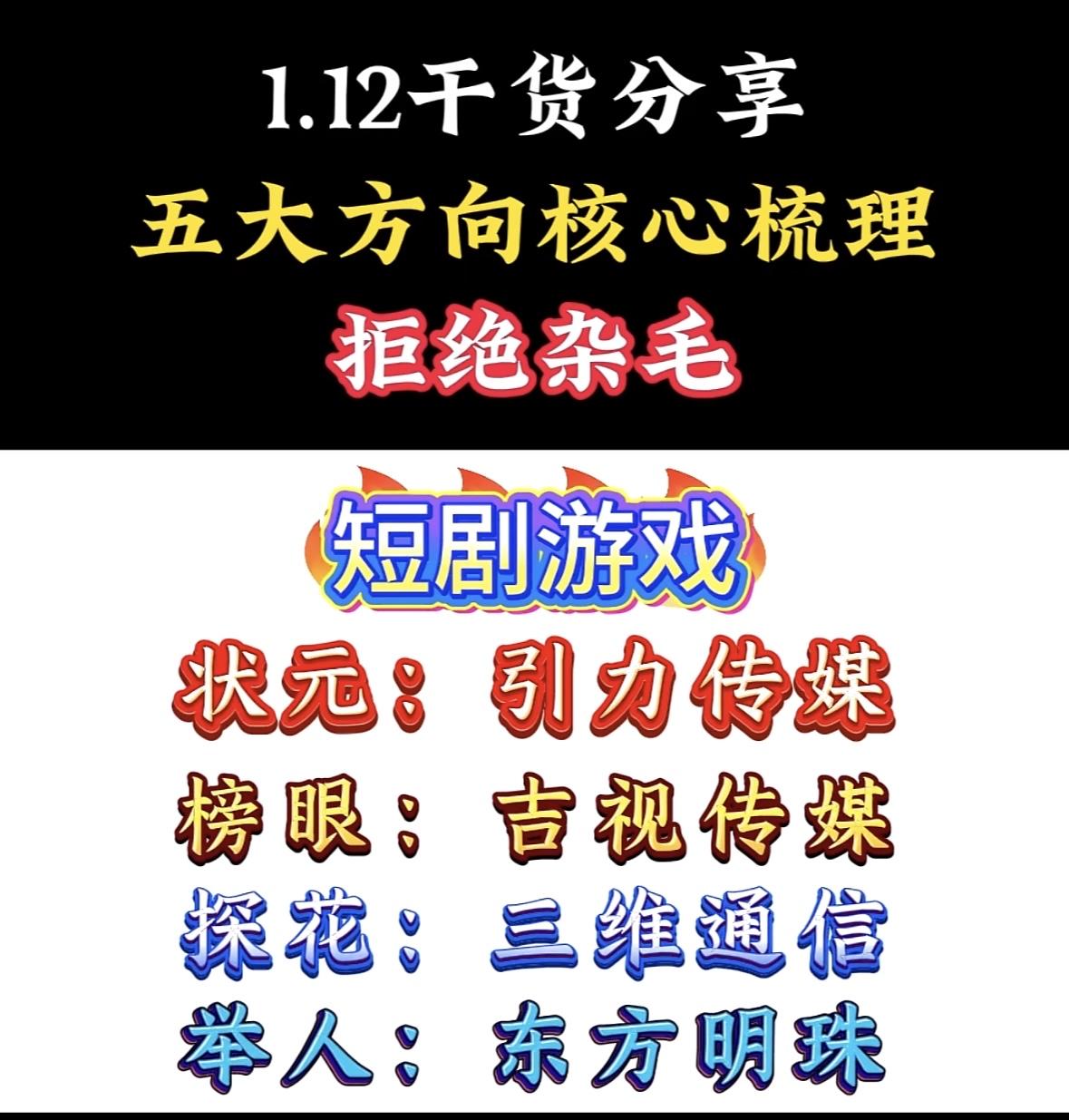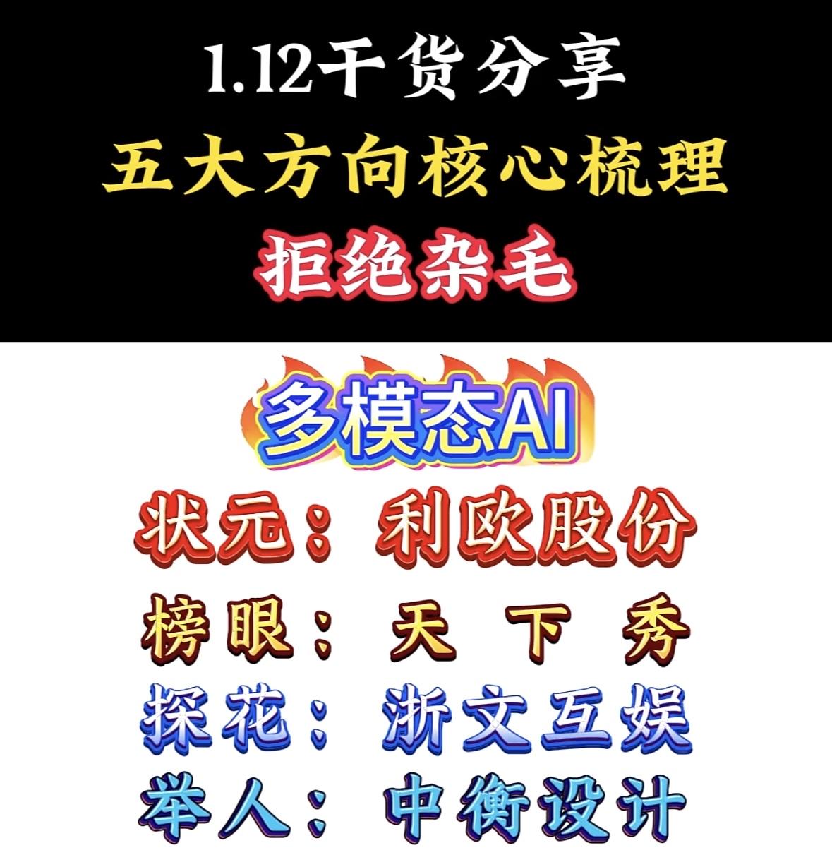 1月12日干货分享:五大方向核心梳理,拒绝杂毛,掌控核聚变! AI营销干货:智谱AD三甲出炉,易点天下夺魁,蓝色光标次席,昆仓方维上榜。聚焦五大方向,去芜存菁。 智谱AD干货精选:易点天下领跑,蓝色光标紧随,昆仓方维与奥飞数据实力上榜,聚焦核心拒绝冗余。