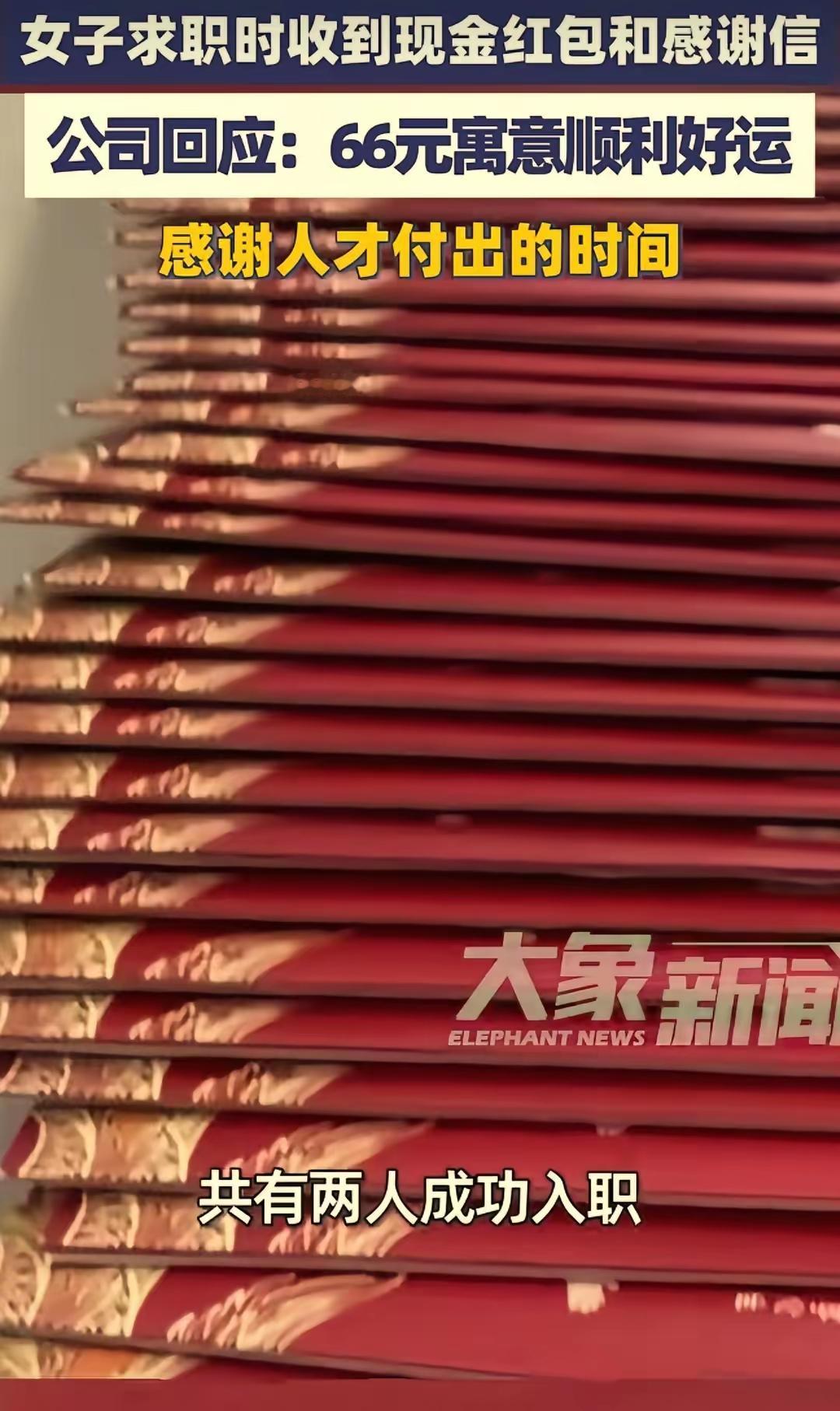 万万没想到!深圳,一女子面试工作,正准备女子面试工作,正准备离开时,人事却突然叫住了她,女子以为面试又要出问题,没成想人事竟然递给她一个66元的红包和一封感谢信,还说:“这是公司对人才的尊重。”女子瞬间被感动了,紧张的情绪一下子就清空了。网友:这是什么神仙公司啊! 女子当场就愣在原地了,手都有点抖。她本来攥着简历,想着这次面试大概率黄了,毕竟竞争的人不少,自己回答问题时还卡了壳。哪能料到,等来的不是婉拒,而是一份热乎乎的心意。 红包是普通的红色封套,上面印着公司的logo,拆开一看,66元整,不多不少。旁边的感谢信更戳人,短短几行字,写着“感谢你为本次面试付出的时间与精力,你的专业态度我们看在眼里”。 她后来在社交平台分享这事,评论区直接炸了锅。有人说这公司格局打开了,比那些让求职者等两小时、面试三分钟的强一百倍。也有人半开玩笑,问地址在哪,想去“蹭”个红包。 其实这不是公司心血来潮,人事小姐姐说,这是公司的固定规矩。不管面试通过与否,都会给候选人发66元红包,寓意“顺顺利利”,既是感谢,也是祝福。就冲这一点,多少人瞬间路转粉。 想想咱们平时面试,踩过多少坑?跑断腿赶过去,填一堆表格,结果面试官全程玩手机;或者面试完就石沉大海,连句“不合适”都懒得说。对比之下,这家公司的操作,简直是一股清流。 66块钱真不算多,却能让人记一辈子。它记着的不是钱,是被尊重的感觉。求职者付出的时间、精力、路费,都是成本,这家公司把这点放在了心上。 有人质疑是营销噱头,可就算是又怎样?能把“尊重求职者”做成噱头,并且坚持下去,就比很多公司强。毕竟,真心换真心,这样的公司,谁不乐意去上班? 职场里的温暖,往往藏在这些小细节里。你尊重别人,别人才会尊重你。这不仅是招聘的智慧,更是做人做事的道理。 各位读者你们怎么看?欢迎在评论区讨论。