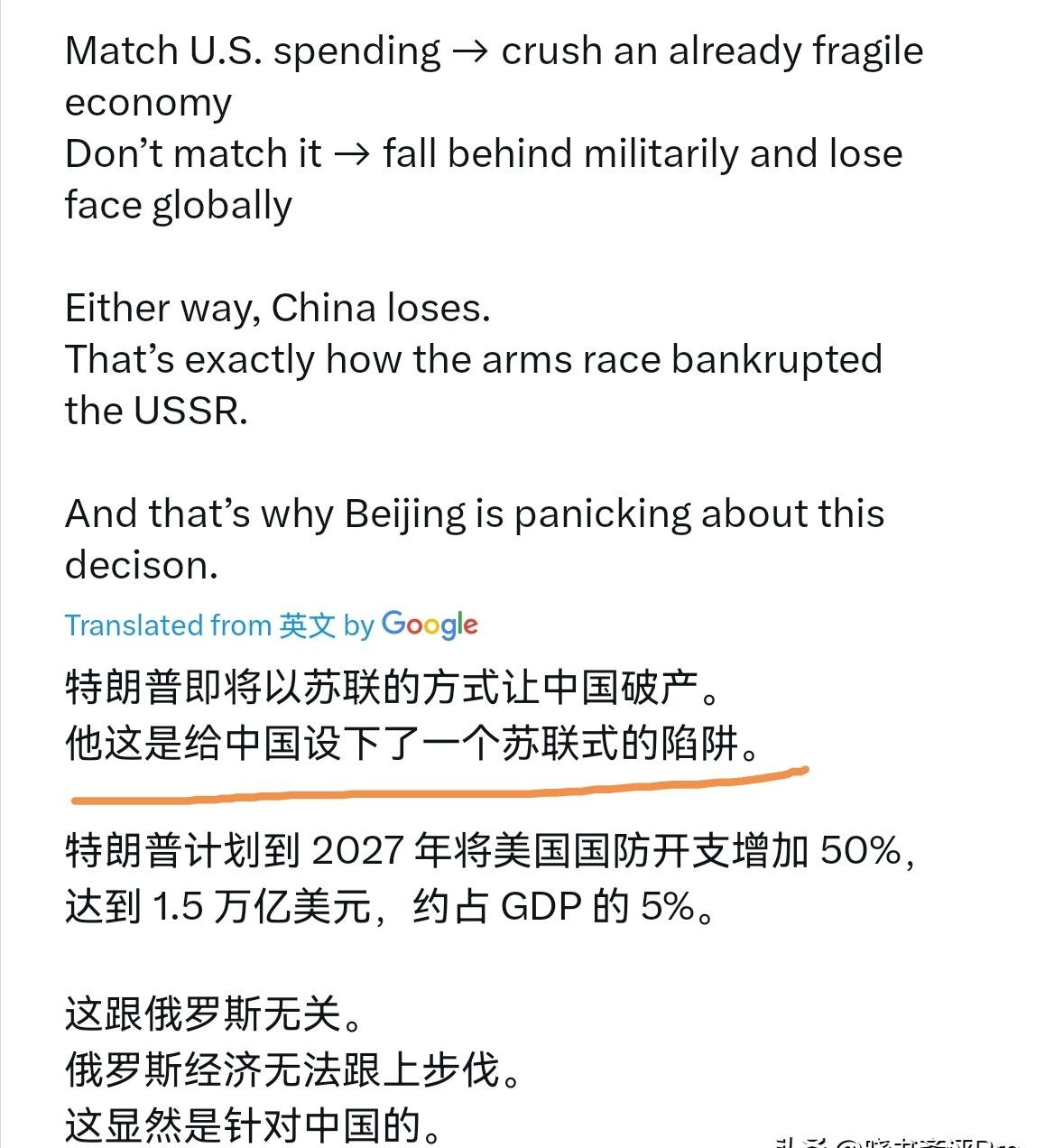 怪不得日本右翼分子不怕我们!在特朗普推出1.5万亿美元的国防开支预算之后,一位日本右翼分子博主写到,特朗普即将以苏联的方式让中国破产。他这是给中国设下了一个苏联式的“陷阱”。 这位明治天皇玄孙出身、长期鼓吹皇国史观的右翼博主,历来以发表贬损中国的言论博眼球,此次更是直言这个预算与俄罗斯无关,就是专门针对中国设下的陷阱。 这笔预算意味着美国国防开支较2026年的9010亿美元暴涨近60%,占GDP比重将达到5%,占美国全年财政支出的21%。要知道美国当前国债已突破38万亿美元,利息负担甚至超过军费本身,在通胀压力尚未缓解的情况下,如此激进的军费增幅,连美国内部都质疑资金来源。 特朗普一边要求整顿军工复合体,限制国防企业高管薪资,一边又砸下重金,看似强势强军,实则暴露了美国军工产业链空心化的困境——本土缺乏足够产业工人,基础教育也难培养出合格技术人才,只能靠砸钱勉强维持战争机器运转。 竹田恒泰口中的里根对抗苏联2.0版本,其实忽略了苏联解体的核心真相。当年里根政府的“星球大战”计划确实搅乱了苏联部署,但苏联的崩溃根源在于自身经济结构的致命缺陷。 彼时苏联GDP不足美国一半,军费占比却高达13.1%,是美国的两倍多,83%的工业投资都流向重工业,能造导弹却造不好面包,甚至爆发过“肥皂危机”。 更致命的是其经济依赖石油出口,美国联合沙特压低油价后,苏联外汇收入锐减,无力进口粮食和消费品,民生困境彻底动摇了根基,军备竞赛只是压垮骆驼的最后一根稻草。 美国此次加码军费,看似复刻历史,实则处境尴尬。1.5万亿美元相当于中国当前军费的6倍多,但中国国防支出始终保持合理增速,2024年国防支出1.69万亿元,增速7.2%,且公开透明,主要用于国防现代化和练兵备战。 与当年苏联被动跟进不同,中国始终坚持国防建设与经济发展协调推进,经济结构多元稳固,既没有过度依赖单一产业,也不存在民生与军工失衡的问题。竹田恒泰刻意渲染中国经济“脆弱”,不过是延续其一贯的偏见,却避谈美国自身财政难以为继的现实。 值得注意的是,美国军工体系的贪腐与低效早已是公开秘密,即便砸下万亿资金,也未必能转化为实际战力。此前有分析指出,美军武器研发周期翻倍、成本超支常态化,再多预算也可能被利益集团吞噬。 而竹田恒泰所在的日本右翼势力,之所以对这笔预算反应热烈,本质上是想依附美国军力谋求私利,却忘了美国从未真正为盟友利益牺牲自身利益,当年广场协议对日本经济的打击就是前车之鉴。 所谓的进退两难,不过是右翼势力的主观臆断。中国既不会盲目跟进军备竞赛,也不会放松国防建设,始终按自身节奏推进强军事业。倒是美国,在国债高企、民生承压的情况下,执意加码军费,究竟是能巩固霸权,还是会重蹈苏联经济失衡的覆辙? 竹田恒泰们的乐观论调,是否低估了中国的发展韧性,又是否高估了美国的可持续能力?欢迎留下你的观点,一起探讨这场军费博弈背后的深层逻辑。