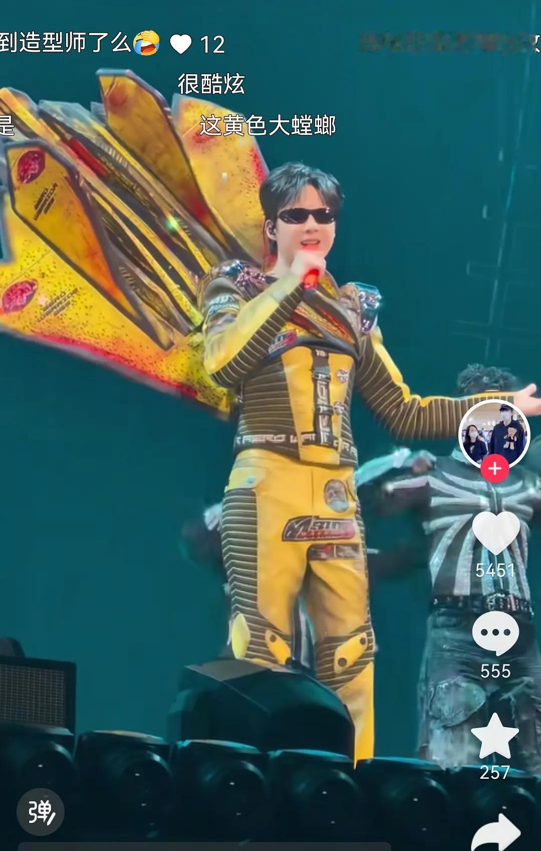 刘宇宁演唱会这个造型有点搞笑[捂脸][捂脸] 这套造型是该把服装造型师叉出去的程度!白色那套挺好的,怎么这套黄色的莫名喜感?!弹幕形容得好贴切:黄色螳螂[泪奔] 服装设计师下次不要这样搞了! 刘宇宁