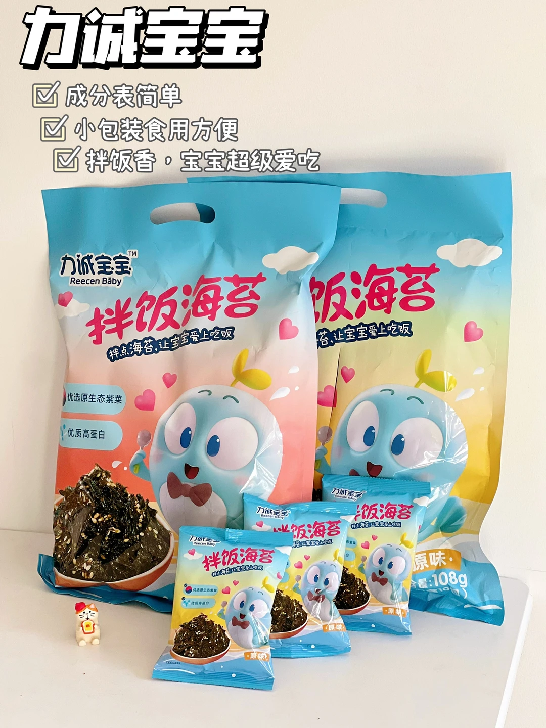 食材都是很日常的,做法也很简单,煮熟食材➕米饭➕拌饭海苔就可以啦,可以借助模具做出各种各样的形状,今天搭配用的是力诚宝宝的拌饭海苔,一个是原味的和珍虾味,拌饭海苔无论搭配什么食材,小朋友都很爱吃,这款海苔成分表干净,而且是独立包装、实用非常方便,出门携带也很方便哦!