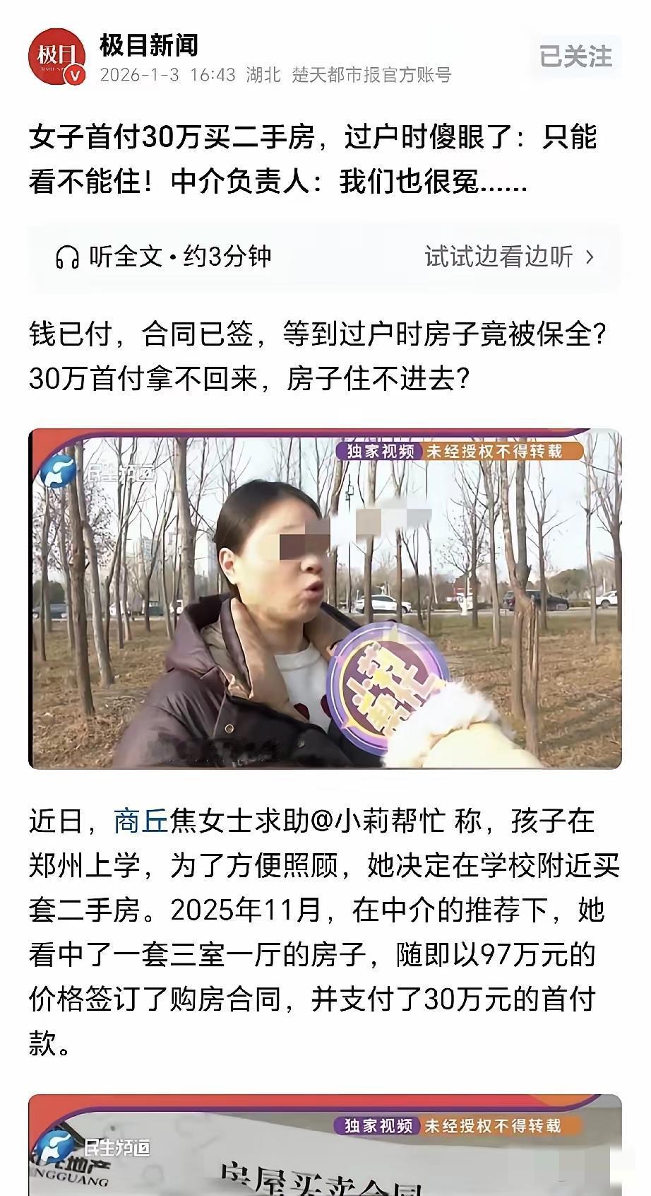 这是诈骗!河南商丘,一女子花97万买了套二手房,双方签好合同,女子支付了30万首付,又顺利办好了贷款,谁知过户时发现,房子被法院查封,无法办理过户,女子这才知道,原房主和男友私底下签有协议,男友占房子70%份额,女房主只占30%,卖房期间,女房主和男友发生矛盾,男友怕她转移,直接申请了房产保全,可房产证上确实显示,房子归女子单独所有,中介无奈,他也不知道会发生这样的事情,女子房财两空: 30万是我全部积蓄…… 这哪是买房啊,这是硬生生踩进了诈骗陷阱!女子拿着房产证复印件,在不动产登记中心窗口前急得直哭,工作人员一句话浇灭了她所有希望:“房子被保全了,查封期间不能过户,这是法律规定。” 谁能想到,房产证上明明白白写着“单独所有”,背后还藏着隐性共有人?根据《民法典》,处分共有房产得经占份额三分之二以上的共有人同意,女房主瞒着男友偷偷卖房,本身就是无效操作 。 这女房主也太黑心了!明知房子有男友的70%份额,还敢拿着单独所有的房产证骗钱。矛盾闹僵后男友申请保全,她倒是一拍屁股躲起来,把买房的女子推到了“钱房两空”的绝境。 中介更别喊冤!作为专业机构,核实房源权属是基本义务,不能只看房产证就完事。之前就有类似案例,中介没查清隐性共有人,最后得承担赔偿责任 。收着中介费不做审核,这跟帮凶有啥区别? 女子现在悔得肠子都青了!30万是她省吃俭用攒了十几年的血汗钱,省下饭钱、抠下房租,就盼着有个自己的家,结果全打了水漂。她找原房主失联,找中介推诿,只能哭着咨询律师走法律途径。 律师说了,她可以起诉解除合同,要求原房主退首付、赔损失,中介也得承担相应责任 。但维权路漫漫,这笔钱能不能全额要回,还得打个问号。 这事儿也给所有人提了醒:买二手房别光看房产证!一定要去不动产登记中心查档,核实有没有查封、抵押,有没有隐性共有人。线上政务平台也能查,花几分钟也能查,花几分钟就能避大坑,别嫌麻烦! 现在很多人买房都是倾尽所有,骗子就是瞅准了这份迫切,钻法律和信息差的空子。咱们买房时多留个心眼,就是给辛苦钱上把锁! 各位读者你们怎么看?欢迎在评论区讨论。
