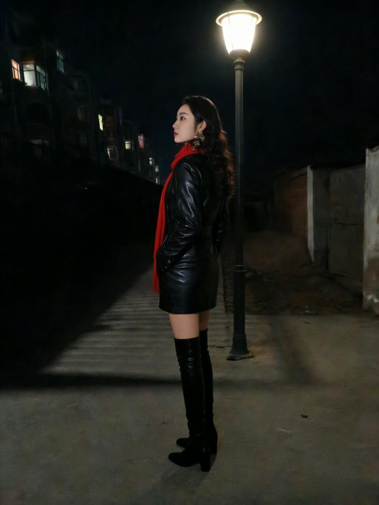 路灯影里步姗姗,衣袂轻扬带夜寒。 莫道冬宵无绝色,一回眸处月同欢。