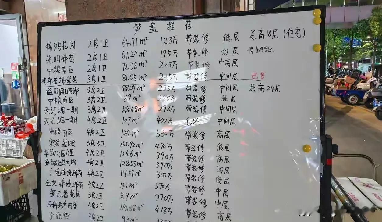 深圳光明这边,路边的中介发布出来的二手房信息。从图中的小区价格来看,均价大约在三万至四万左右,甚至也有两万多的价格。不知道和高峰期比,价格下降了多少呢?不过在深圳这边,这个价格还算可以吗?
