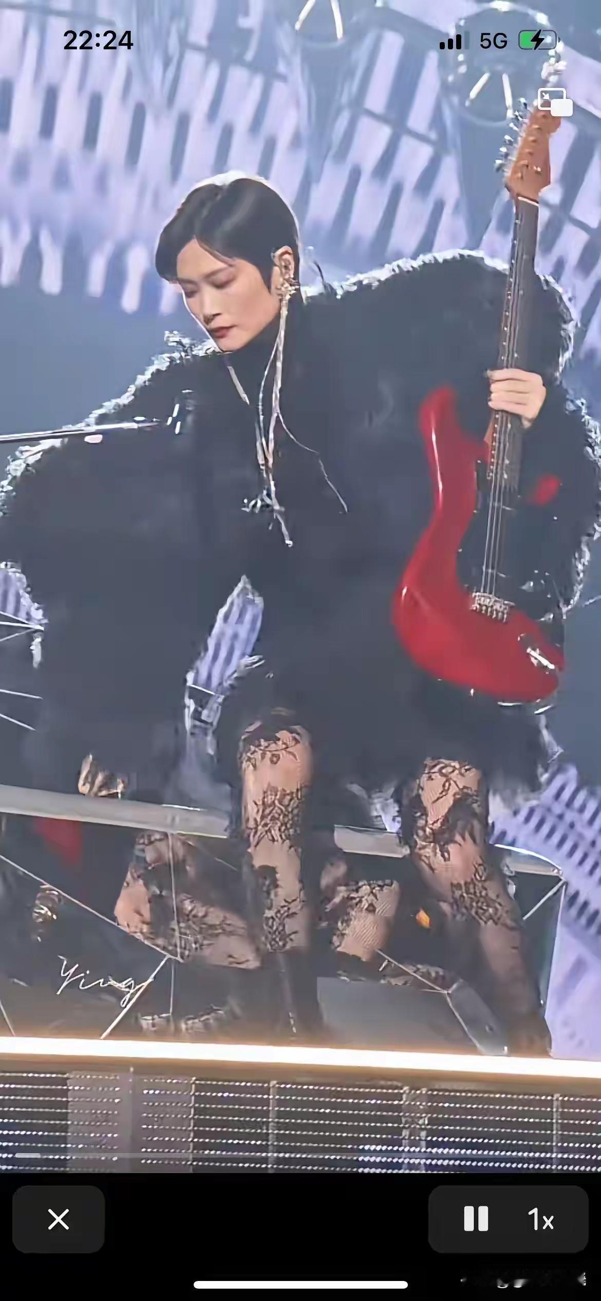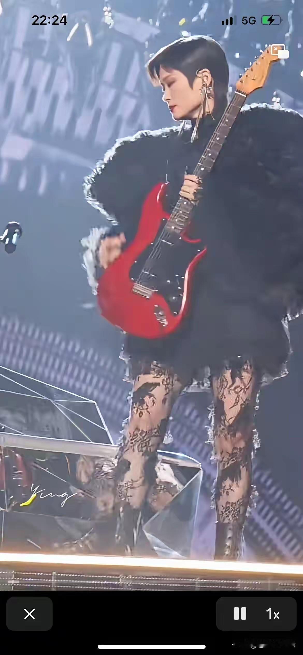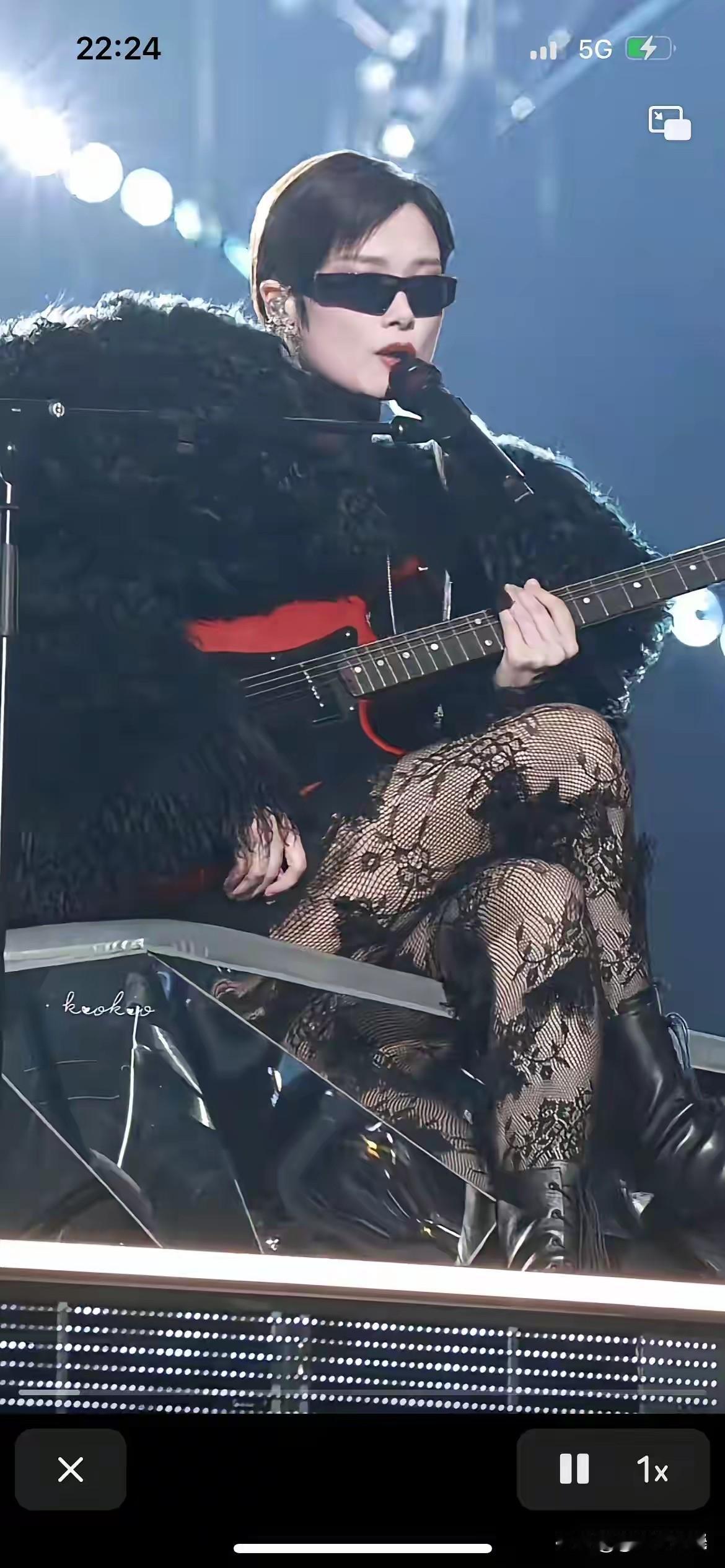 李宇春真是又美又飒,春哥变春妹了。 李宇春黑色蕾丝网眼袜,配黑色皮靴,上身穿黑色皮草短上衣,戴黑色墨镜,手拿红色吉他,惊艳登场。 始终不变的是李宇春的头型,总是一头干练利落的短发,配这身打扮稍显拘谨,如果李宇春换一个女性一点的头型,效果会更好。 图自网络侵必删