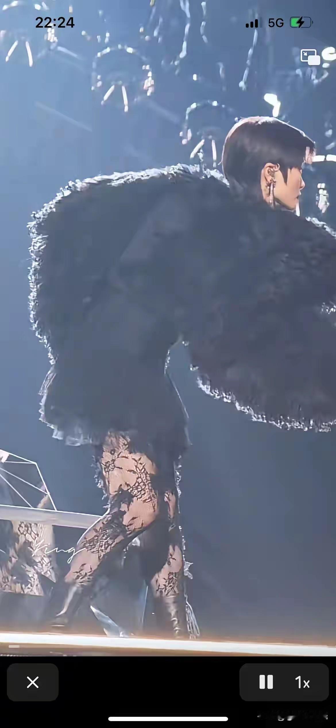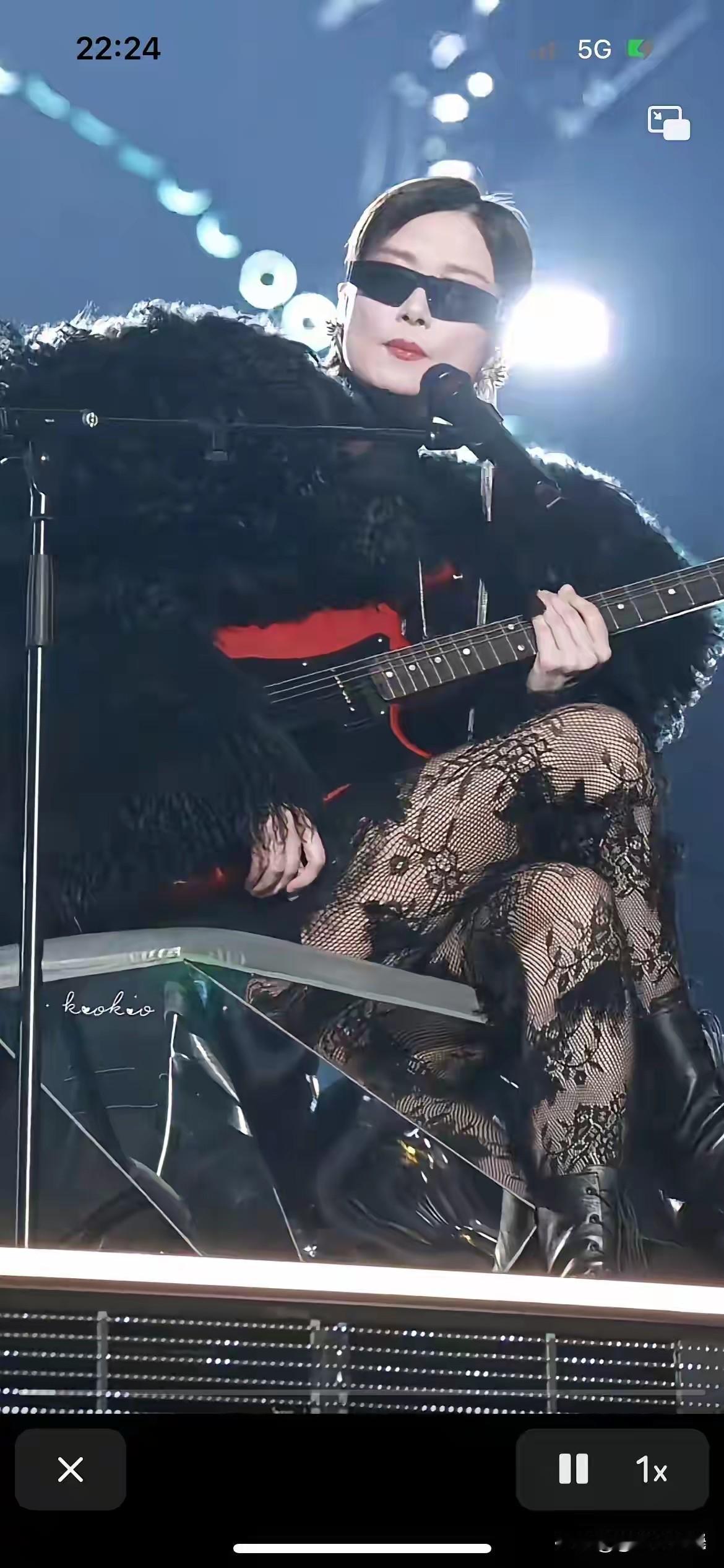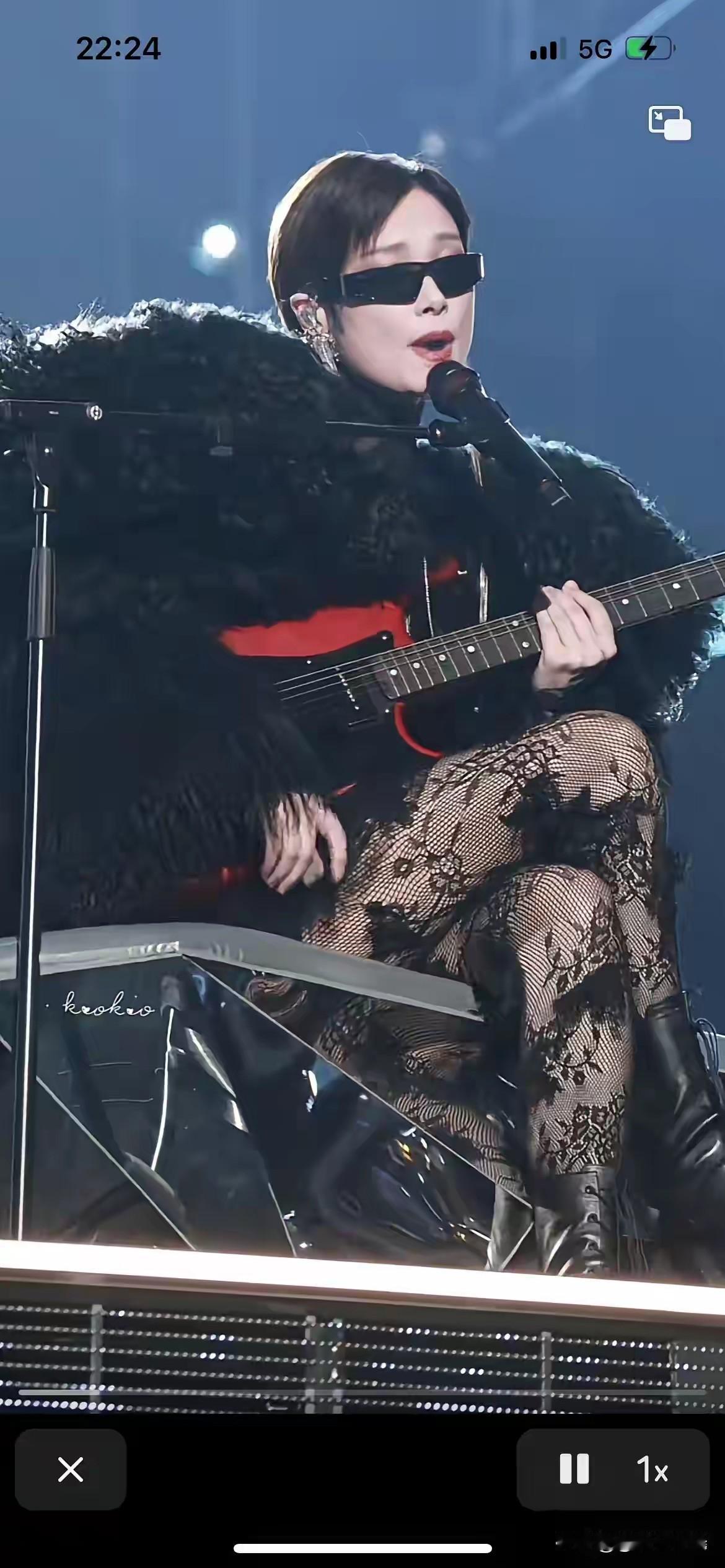 李宇春真是又美又飒,春哥变春妹了。 李宇春黑色蕾丝网眼袜,配黑色皮靴,上身穿黑色皮草短上衣,戴黑色墨镜,手拿红色吉他,惊艳登场。 始终不变的是李宇春的头型,总是一头干练利落的短发,配这身打扮稍显拘谨,如果李宇春换一个女性一点的头型,效果会更好。 图自网络侵必删