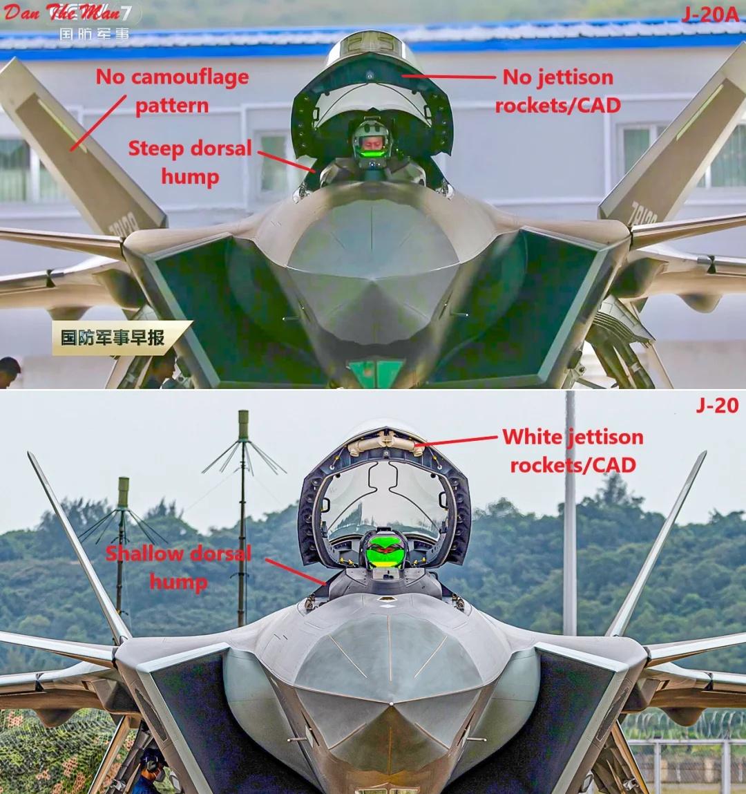 J-20与J-20A正面之比较 由于配备了360度全向EOTS,J-20A具备了更加强悍的对地作战能力。另外由于采用直接穿盖弹射,J-20A取消了绝少使用的舱盖逃离火箭。图片来源于网络 歼20 歼20A 隐身战斗机