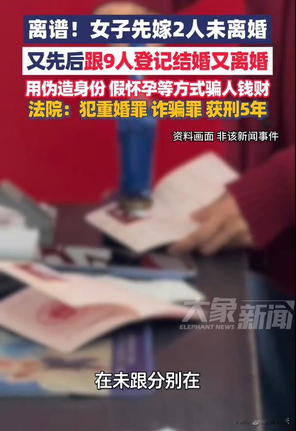 广西,一女子先嫁2人没有离婚,又跟9人结婚、离婚,女子不图享用不同男人的快乐,而是在于骗钱。利用大龄男子渴望结婚的心理,先骗取他们的彩礼钱,之后又伪造怀孕单子,以此作为借口再次骗钱。直到最后,女子又经人介绍,迎来自己第12次“婚姻”,这次,还是想着骗婚、骗钱。真可谓是现代版“陈世美”,如此壮举真是令人震惊。 很难想象,一个人的一生竟然能和“结婚”这件事纠缠得如此疯狂。广西来宾一位名叫张某的女子,硬生生把神圣的婚姻关系玩成了一场让人瞠目结舌的敛财游戏。她不是在结婚,就是在去离婚的路上,甚至在还没离婚的时候就已经把下一任“丈夫”领进了门。 这场跨度长达二十多年的荒诞剧,最终在2025年的年底画上了句号。随着广西来宾市中级人民法院的裁定下达,一名曾在 12 个男人间周旋的女子,因重婚与诈骗两项罪名,即将开启长达 5 年的囹圄生活,等待她的将是法律的惩处。 对于大多数人来说,婚姻是情感的归宿,但在这个生于1977年的女人眼里,那一纸婚书不过是提款的密码。早在千禧年之初,她的操作就已经让人看不懂了:2000年刚和第一任丈夫关某领了证,两年后在法律关系存续的情况下,她竟然转身又和另一位左姓男子登记结婚。 这两段重叠的婚姻似乎让她尝到了甜头,发现了这其中的“商机”。从2006年到2018年这十几年间,她仿佛开启了“倍速模式”,走马灯似地和8名男子经历了登记结婚又离婚的流程。 每一次的迎来送往,大概率都伴随着彩礼的入账和身价的“套现”。直至2018年,她历经了第11次登记。这段关系维系三载,虽曾有过相伴时光,却终究未能长久,于2021年劳燕分飞,各奔东西。这一连串令人眼花缭乱的操作,早已超出了正常感情生活的范畴,完全就是一条精心设计的流水线。 随着年龄增长,单纯靠领证似乎满足不了她的胃口,手段也开始变得更加赤裸和卑劣。她把目光精准锁定了那些渴望家庭温暖的大龄男青年,利用他们急于成家的心理,把自己包装成完美的结婚对象。 2022年,情场阅历颇丰、阅男无数的张某,经中间人牵线搭桥,结识了受害人黄某。这一次,她连去民政局的功夫都省了,直接办了一张假身份证和假结婚证,就和对方以夫妻名义生活。为诓骗钱财,她费尽心思编造诸多借口。先是称母亲患病,后又言自己孕期需产检,甚至还编造刚出生的孩子生病等理由,无所不用其极。 这一套组合拳下来,黄某被骗走了将近11万元。更离谱的是,在榨干黄某的同时,她还有精力在抖音上寻找新猎物。2023年,另一位受害人吴某也掉进了陷阱,几万块钱的血汗钱以“买金项链”、“还债”的名义进了张某的口袋。 当2024年6月这双贪婪的手终于被铐住时,张某并没有表现出多少悔意,反而在法庭上玩起了新的花样。在一审被判刑后,她竟然提起上诉,理由也是让人大跌眼镜:她声称自己户籍年龄登记错了,实际是1984年出生的。 按照她的逻辑,既然年纪改小了,那她前两次结婚时就没达到法定婚龄,所以那不算重婚。至于骗来的那些金银首饰和钱财,她坚持认为那是恋爱期间的赠与,不应该算作诈骗。 这种近乎耍无赖的辩解,显然低估了法律的严肃性。二审法院经过调查,认定除了一张嘴,没有任何客观证据能证明她“变年轻”了。至于那些钱财,法官更是一针见血地指出:隐瞒婚史、用假证件、虚构用途,这就是赤裸裸的诈骗。 2025年12月22日,来宾中院驳回上诉、维持原判的裁定一经下达,这场曾喧嚣一时的闹剧便尘埃落定,终告落幕。除了要承受五年牢狱之苦,还需缴纳罚金外,她还得向两名受害者退赔款项。经统计,退赔总计金额约为13万元。只是不知道,这漫长的铁窗生涯,能否让她明白,感情和婚姻从来都不是可以随意买卖的商品。
