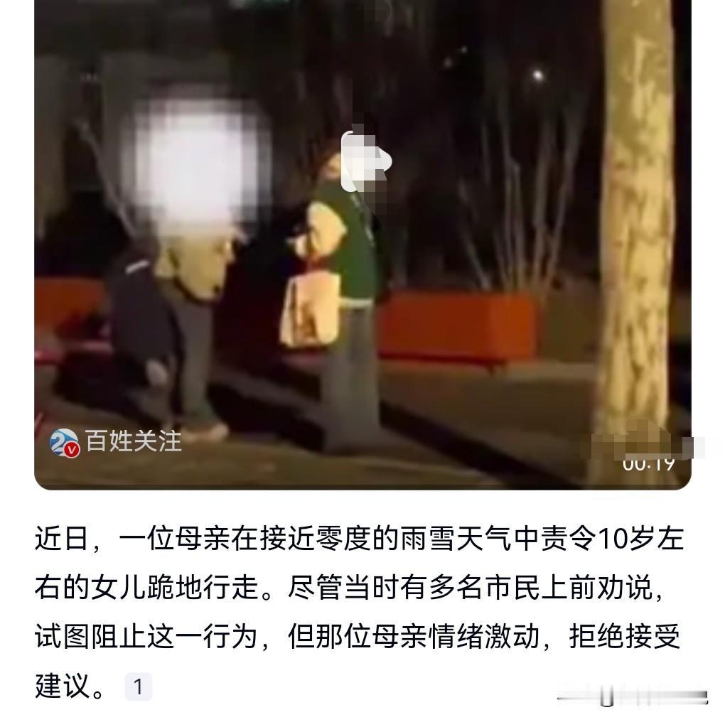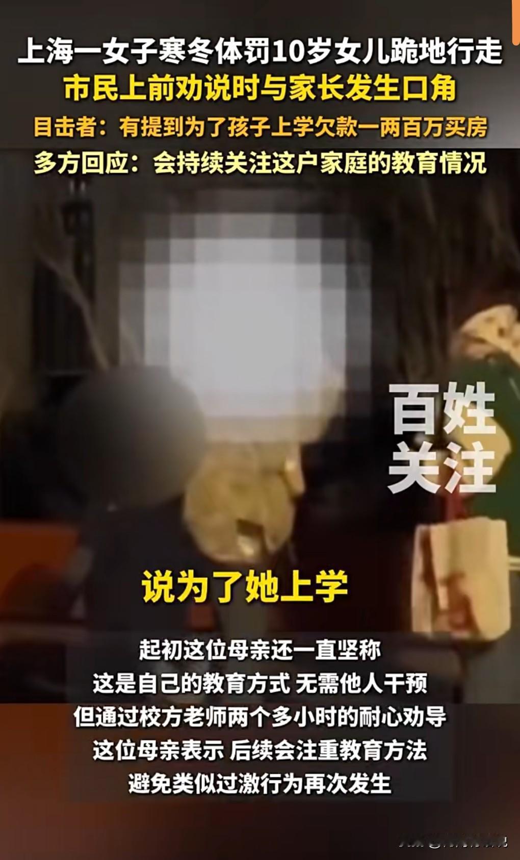 遇到这样的母亲真的是太悲哀了,竟然这么惩罚自己的孩子,这样的教育方式太残酷了。 近日上海,10岁孩子被罚雨雪天气室外跪地行走。 很多人看不下去,没想到这家长还和这些劝说的人发生口角。 真是油盐不进啊。 后来经过老师耐心的劝导,女子表示会改变教育方式。 这女子说为了孩子上学,欠了一两百万买房。 没钱买什么房啊,真是的。