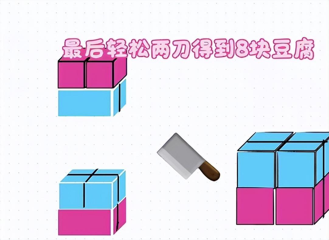 家长怒怼老师出题错了!“豆腐两刀切成8块”,答案一出全场傻眼 本科学历家长被小学数学题难住,直接找老师理论:“一块豆腐两刀怎么切出8块?这题肯定出错了!” 结果老师一句话,让家长当场愣住。 这事还得从孩子的作业说起。一道小学题要求“两刀把豆腐切成8块”,家长拿过题信心满满,可琢磨来琢磨去,横竖切、斜着切,最多也就4块,怎么都出不来8块。 为了不丢面子,家长直接断定题目出错,让孩子空着去学校,结果孩子被批评。家长气不过找老师讨说法,却被老师一句话打脸:“这题很简单,班上好多同学都做对了。” 随后老师给出的答案,彻底颠覆了家长的认知。 原来这根本不是平面几何题,而是空间思维题!先横着切一刀,把豆腐分成上下两层;接着竖着切第二刀,关键来了——切上层的时候切完,把上层豆腐旋转一下,再用这一刀继续切下层。 相当于第二刀在两层豆腐上各切了一次,严格算下来只切了两刀,却硬生生切出了8块豆腐! 家长恍然大悟的同时,后背直发凉:现在的小学数学题,都这么考验空间想象力了? 把这道题发到网上后,网友们也炸开了锅。有人调侃“我连豆腐都切不明白,更别说做题了”,也有人点赞:这种题根本不是刁难孩子,而是逼着孩子跳出“一刀切”的思维定式,学会多角度思考。 毕竟现在的教育早就变了,不再是死记硬背公式,而是更看重孩子的思维发散能力。从“学会做题”到“学会思考”,这才是这类题的真正意义。 你能想到这个解题思路吗?
