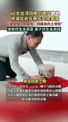 泪目了!近日武汉天河机场,一位60岁老人背着个大红包裹走下飞机,来到出站口时突然将红包裹放在地上随即便跪了下去,而对面也有一群人走过来看到包裹后也跪下了,原来这包裹里面的是湖北籍老兵骆传知的骨灰,而对面走过来下跪的正是骆老的孙子孙女和其他亲属。 那个被红布紧紧包裹的行囊,落地时并没有发出太大的声响,却在武汉天河机场熙攘的人潮中,砸出了令人窒息的寂静。 这一幕发生在1月9日,一位花甲老人佝偻着背,在出站口缓缓弯下双膝,向着地上的红包裹庄重地磕了三个头。对面早已等候多时的一群人,眼泪瞬间决堤,像是被某种无形的力量牵引,齐刷刷地跪倒一片。 这不是什么古装剧的拍摄现场,而是一场迟到了大半个生平的重逢。背着400多个承诺的“摆渡人” 那位下跪的老人叫刘德文,来自台湾。在他并不宽厚的肩膀上,背负的不仅仅是这一个红包裹,而是海峡两岸二十多年来无数游子的归乡梦。 为了这一刻,他已经自费奔波了二十多个省份。从2003年起,他就像个不知疲倦的“灵魂摆渡人”,在时间与岁月的夹缝中寻找线索,硬是将近400位在台去世老兵的骨灰,一步步背回了大陆故土。 这一次,他护送的是湖北籍老兵骆传知。在这个编号为“419”的归乡档案背后,是一段横跨海峡、耗尽余生的漫长等待。刘德文在那头,把寻找当成使命。家属在这头,把等待熬成了本能。当红布解开的那一刻,所有的奔波与艰辛,都化作了那句带着颤音的感叹:“回家了。” 骆传知老人的故事,听来让人心口发堵。当年的他把青春扔在了边疆的哨岗上,后来又因历史的洪流漂泊至台湾。海峡这头,是誓不再嫁的妻子,独自一人含辛茹苦将两个孩子拉扯大。海峡那头,是终身未再娶的丈夫,在异乡的每一个深夜独自吞咽着乡愁,两人自那一别,便是一生。 长孙骆明记忆里的爷爷,是父辈口中那个英勇的军人,是每次探亲时口袋里带回的外地糖果,更是那个总是望着北方发呆的落寞背影。谁能想到,两位老人用各自的孤独,为“忠贞”二字写下了最凄凉也最厚重的注脚。因为种种原因,生前未能相见,死后魂归故里成了骆老临终前唯一的执念。 超越血缘的真正“亲人” 机场大厅的阳光透过玻璃幕墙洒下来,显得格外刺眼。周围行色匆匆的旅客停下了脚步,有人默默递上纸巾,几位路过的退役军人自发站成一排,敬上了标准的军礼。 在这场没有彩排的仪式中,刘德文将骨灰郑重地交到了骆明手中。那个特意准备好的袋子,此刻沉甸甸地压在孙子的胸口,仿佛那是爷爷从未拥抱过的温度。 家属们激动地拉着刘德文的手,满腔的感激堵在喉咙里不知从何说起。而这位两鬓斑白的老人,只是轻轻拍了拍他们的手背,说了一句足以消融所有隔阂的话:“我们都是一家人。” 是啊,地域或许有界限,但人心没有。从台湾到湖北,这段路刘德文走了无数次,只为了让那些漂泊的灵魂不再孤单。就像网友们感慨的那样,落叶归根是中国人骨子里最深的羁绊,而刘德文用双脚丈量的,正是这条通往团圆的温暖回家路。