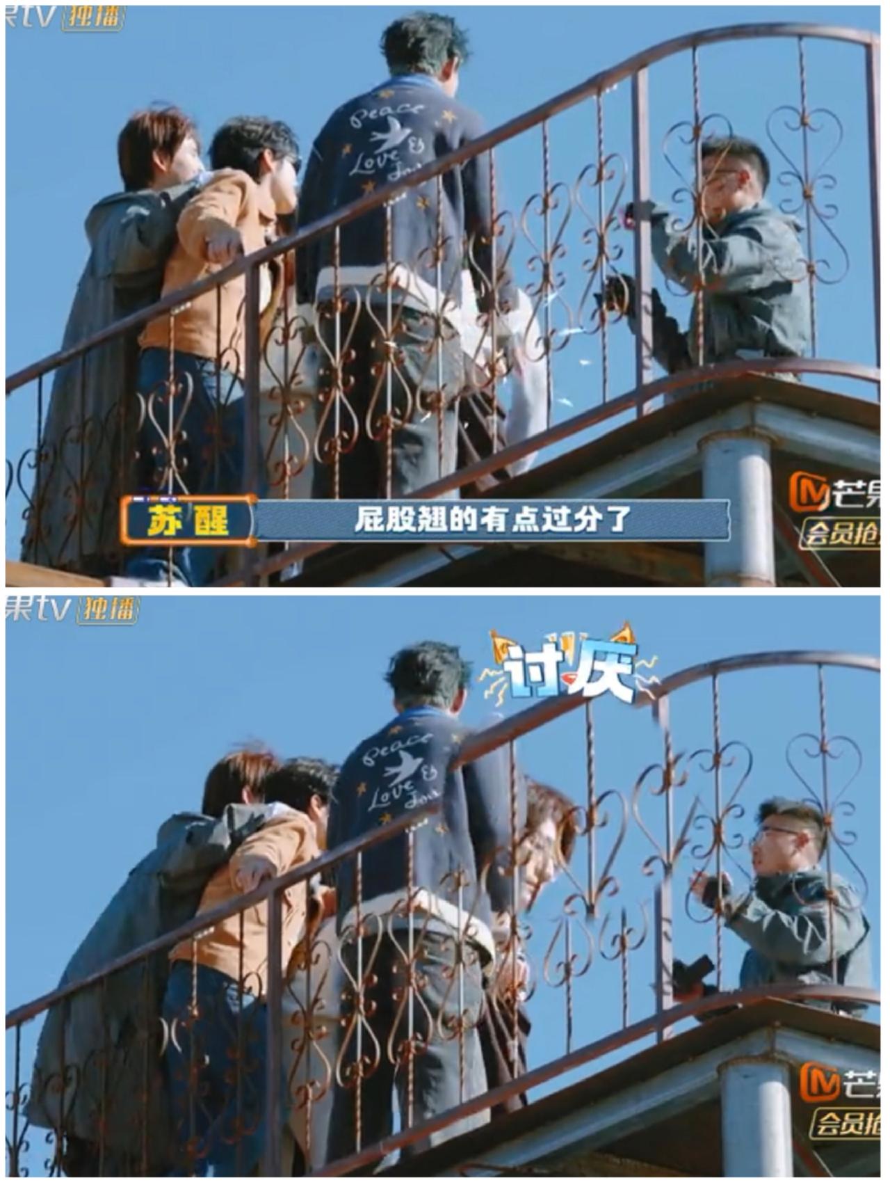 苏醒这一下, 直接把王铮亮送上热搜, 网友满是惊讶。 苏醒,陈楚生6个人拍摄 节目宣传海报, 节目要求拍摄一个跑圈的动作, 为了配合苏醒右脸拍摄角度, 其他5位兄弟不得不逆时针跑圈, 一边调侃一边乖乖的跑。 但是到了到天台拍摄海报时, 不和谐的一幕出现了, 有个“东西”不知好歹, 竟然挡住了苏醒的镜头。 哦, 原来王铮亮的屁股翘太高, 有点挡到苏醒镜头, 于是苏醒忍不住拍了他屁股一下。 哎呀, 苏醒这随意轻轻一拍, 说不定已经预定了一个热搜, 叫“王铮亮屁股太翘,挡住苏醒镜头”。 你说, 苏醒不说, 我们这些网友隔着屏幕 哪里知道王铮亮屁股是否翘, 结果现场苏醒这样一拍, 全网都知道了。 人家王铮亮明明是想靠实力出圈, 这下苏醒一拍, 让王铮亮不得不靠“好身材”出圈, 真的藏都藏不住呀。