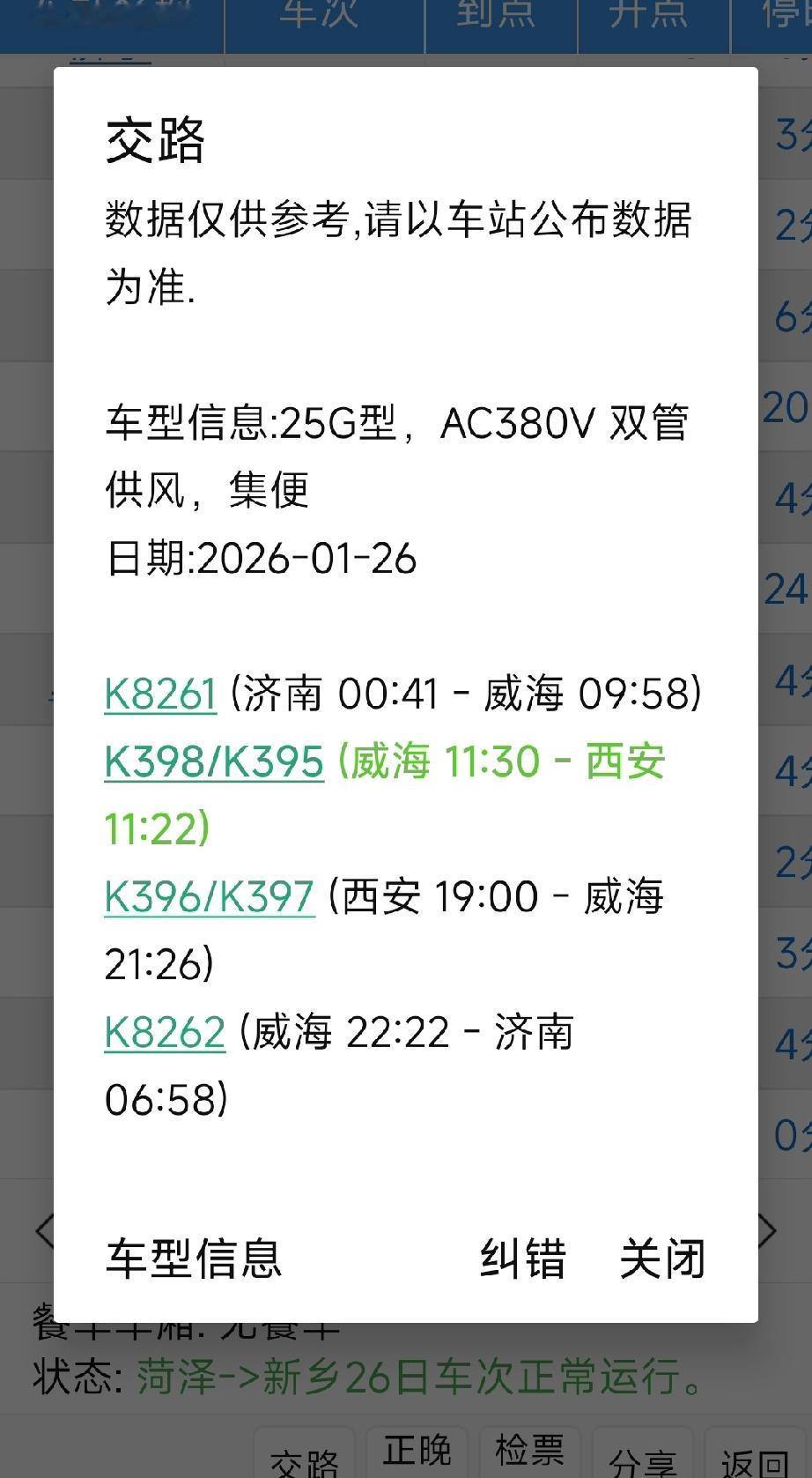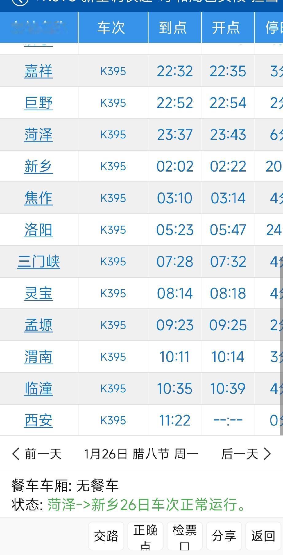好消息!威海到菏泽K395次列车延长到西安站! 近日随着铁路一季度调图,威海到菏泽K395延长区间到西安站! 原日照到许昌的K2156次临时停运! 但是东明,长垣两站仍然不办客,因为两站正在进行改造不具备办客条件,开行时间仍需等待! 以后菏泽,新乡间会有4个车次停靠,好消息!