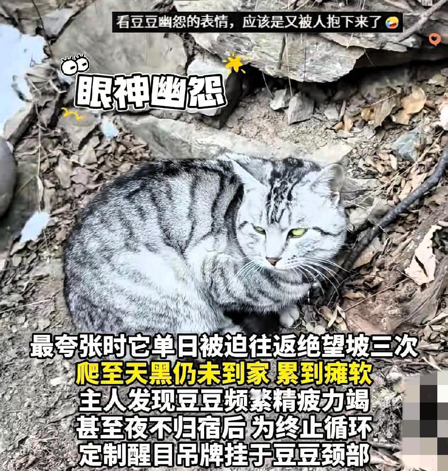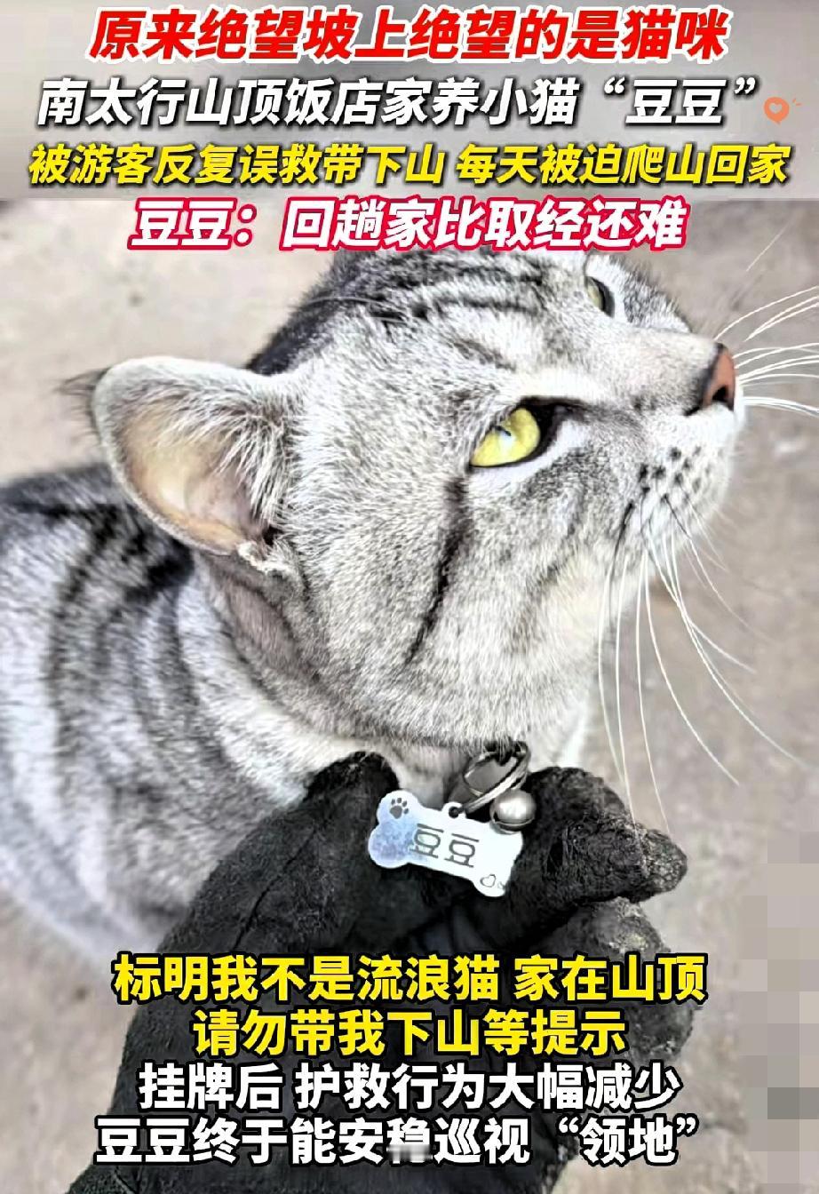 南太行的“绝望坡”,原来绝望的不是爬山的人,是被游客“好心”逼成“爬山特种兵”的小猫豆豆! 明明是山顶饭店的“土著”,每天上山溜达纯属日常,却硬生生被一波又一波热心游客当成流浪猫。 你以为是拯救落难小可怜,殊不知人家只是下班回家,结果被强行“遣返”山脚,只能吭哧吭哧重新爬。 最绝的是一天被抱下山三次,累到瘫倒,主人只能给它挂个牌子“家在山顶,别送我走”,这波操作又心疼又好笑。 其实很多时候,我们的善意都太“自我感动”了,没搞清楚对方是不是真的需要,就急着付出。 对动物是这样,对人有时候也一样,把自己的想法强加于人,好心反而变成负担。 真正的善良不该是盲目的热情,而是多一点观察和尊重,你说对吧? 你有没有过好心办坏事的经历?评论区聊聊~