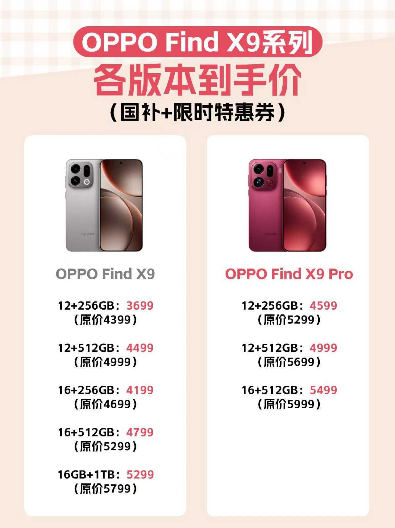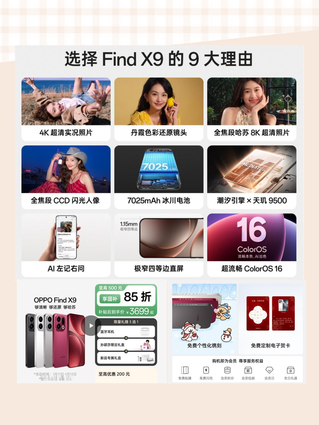 春节前买OPPO Find X9系列超全攻略 🎇马上就要过年啦!春节前不少人打算换手机~ 看中OPPO Find X9系列的先别急,先搞清楚活动,别买贵了! 这里帮大家整理好了全系价格以及活动,大家照着抄答案就行了~ 新年限时特惠券-200,还支持国补-500,叠加到手价👇 📱OPPO Find X9标准版起步3699 📱OPPO Find X9 Pro起步4599 活动期间入手还有价值299的限量礼盒(莎莎盒子、线条小狗盒子、新品盒子等多选一) 支持至高24期免xi,国补三重礼拉满了,这个时候入手相当划算~ 年前这波活动OPPO也是很用心啦,果然晚买享折扣手机对的! 至于具体选哪个型号,还是得看个人需求的 预算在3-4k档位的就选标准版,手感、系统、续航、拍照都很不错,性价比高~ 预算4-5k档位,喜欢拍照的就选Pro款,哈苏真2亿像素嘎嘎出片~ 两款体验都很优秀,选哪款都不怕踩坑~