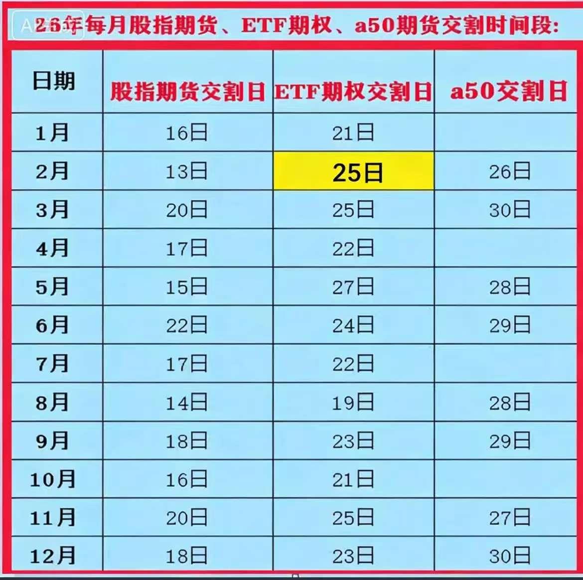 股市大概率会在本周四或者本周五出现调整,周二周三应该还会继续涨。查了一下,1月份股指期货交割日在16日(本周五),ETF期权交割日在1月21日(下周三)。一般交割日前后股市比较容易出现较大波动。所以本周后半段大家开始需要小心了。如果1月份的期指交割日大盘依然涨个不停的话,那么收割韭菜的时候可能会是2月25日,也就是春节回来开盘第二天。预计春节第一天回来复制24年10月8日,第二天复制10月9日千股大跌?