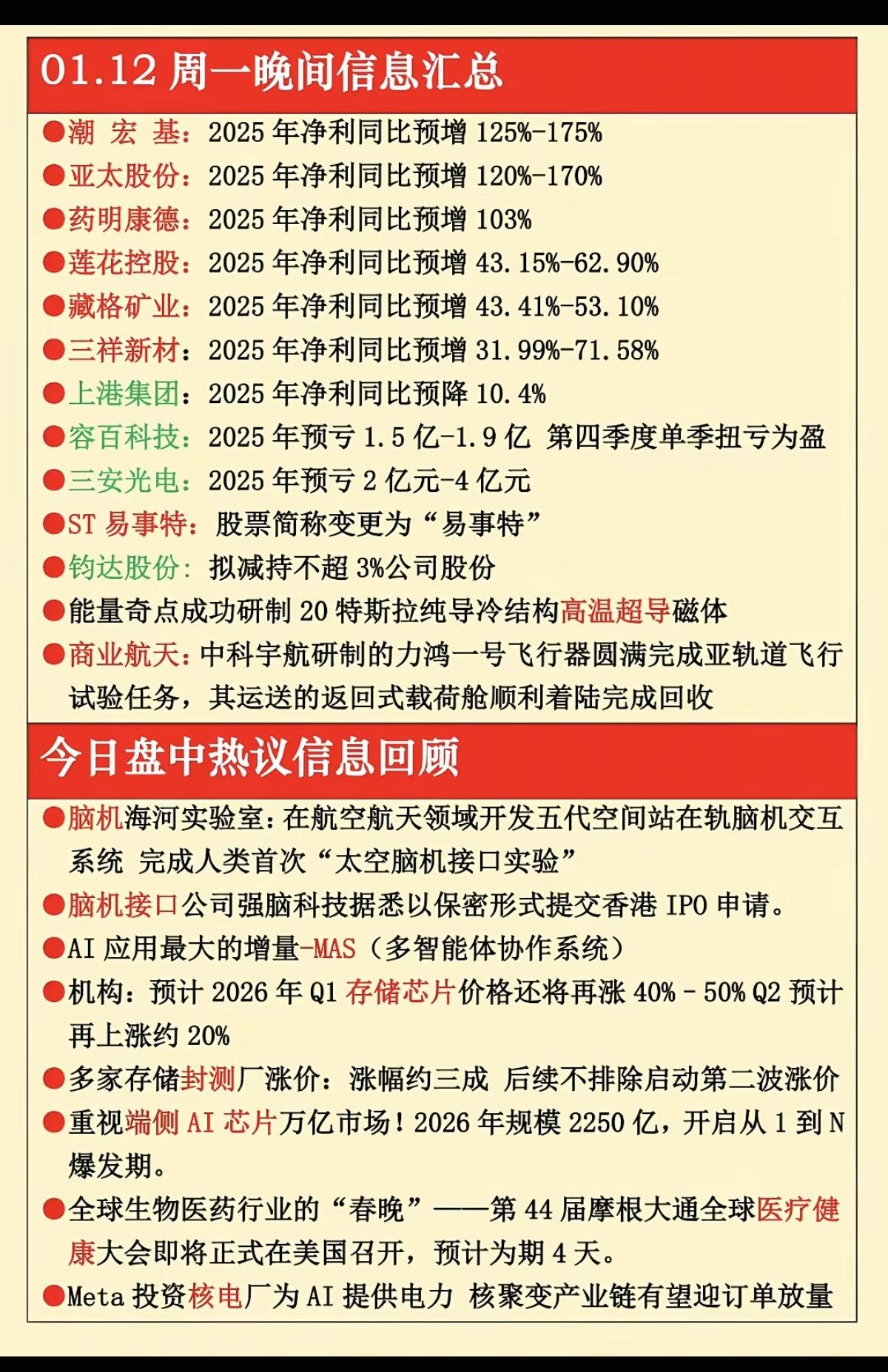1.12周一晚间 财经信息汇总! 1.商业航天 2.脑机接口 3.多家存储封测厂涨价 4.端侧AI芯片 5.核电核能 6.多家公司业绩预告