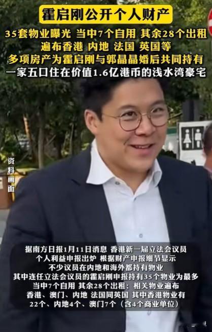 当富豪们的一纸财产公开,网友真正关心的不是他们到底有多少资产,而是那些高墙背后是否藏着利益漩涡和社会公平的裂缝。 霍启刚公开35套房产,震惊程度远不止数量那么简单,触动了公众对“财富到底该如何被看待”的深层思考。 这些房产遍布香港、内地,甚至远及法国和英国,宛如一张跨国版图,背后是高度集中的资产布局。7套房自用,28套对外出租,这样的安排看似合理,却鲜明地反映出财富流动与普通大众生活之间的巨大距离。 毕竟,藏身别墅区的轻松与千千万万普通家庭的租房压力形成鲜明对比。国人大多并不仇视财富本身,仇的是“为富不仁”的态度和行为。 霍启刚与郭晶晶作为公众人物,能够坦然面对财产公开,甚至选择部分合作持有,展现的是一定程度的透明和责任感,这在炫富文化泛滥、隐藏资产惯例普遍的社会现状中,无疑是值得一提的正面信号。