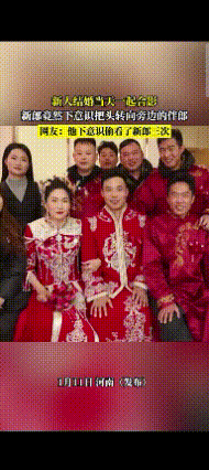 河南,新人结婚当天一起合影,新郎竟然下意识把头转向旁边的伴郎。新郎停顿了许久,才