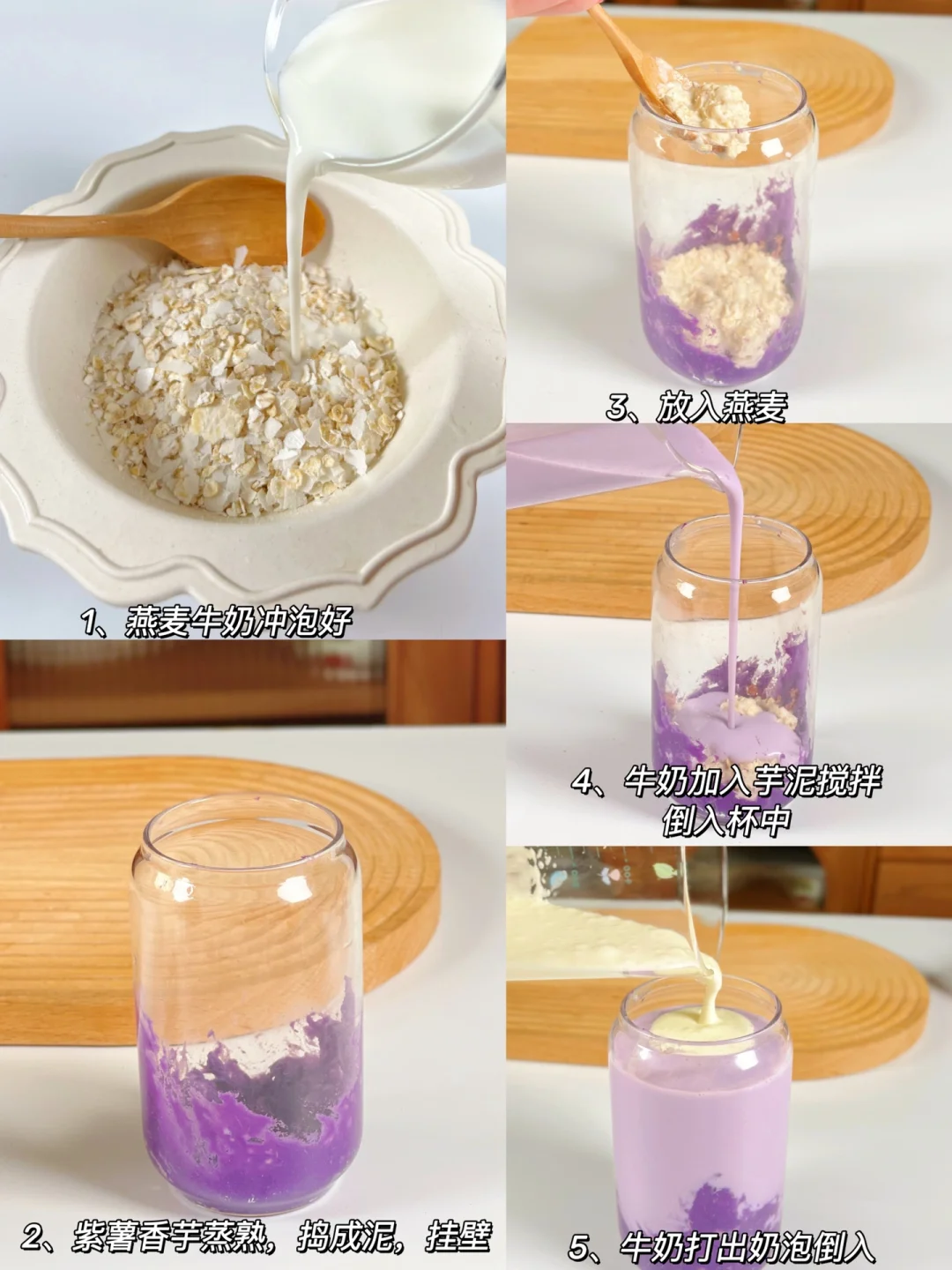 制作:紫薯香芋蒸熟,混合碾压成泥,取适量放进杯子挂壁,剩余放入牛奶搅拌均匀,燕麦冲泡好,放入杯中,倒入芋泥牛乳液,牛奶打发成奶泡,最后倒入即可