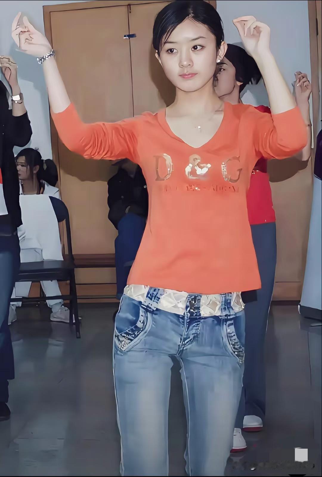 早期的赵丽颖美图,那时她身着简约的橙色上衣,没有过多华丽的装饰,下身搭配着经典的牛仔裤,尽显朴素自然。