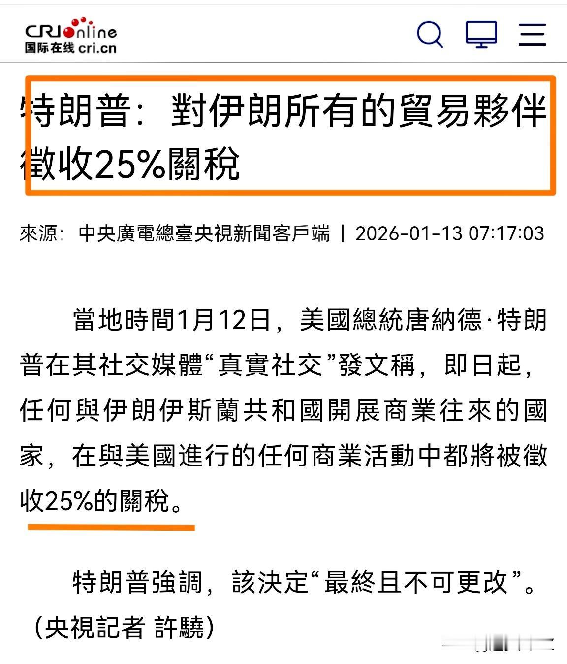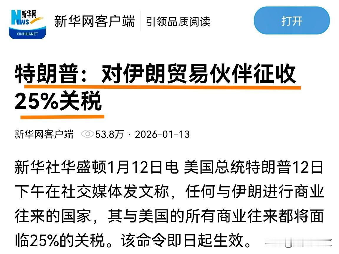 伊朗局势突变,特朗普又出鬼点子,直接打击第三方国家,任何与伊朗有商业往来的国家,在与美国进行任何商业活动时,都将被加征25%的关税。 这不就是借着打击伊朗名义,具体的经济制裁一些国家,同伊朗贸易国家主要是中国、印度、俄罗斯…,涉及到商业活动石油、武器装备采购… 特朗普这一招够狠的,一剑一箭多雕,可是,特朗普没有想到,作用力与反作用力原理,这些国家(中、俄、印…)齐心合力,反制美国关税,美国有可能被关税打的遍体鳞伤。 附:伊朗主要贸易伙伴,包括中国、阿联酋、伊拉克、土耳其、沙特、德国、俄罗斯、印度和阿富汗等国家 国际观察今日热点 追梦人HZ