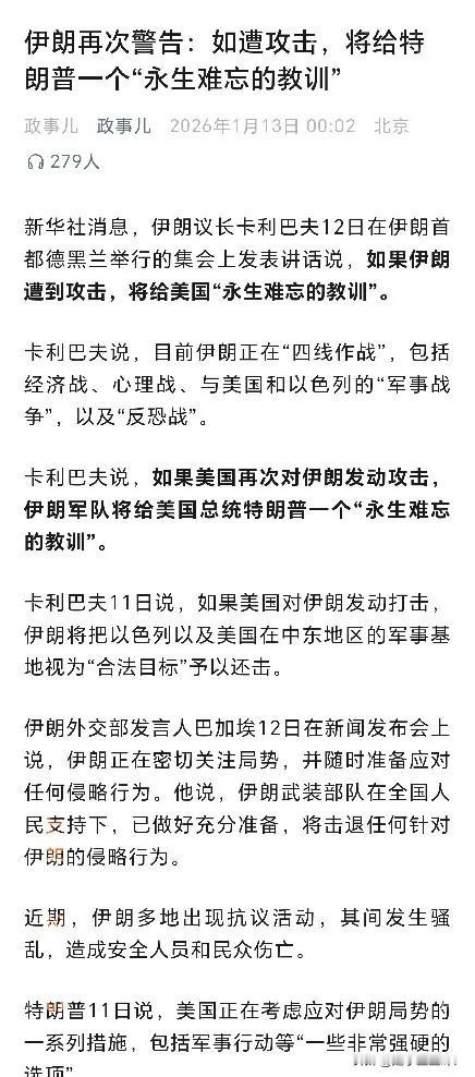 特朗普吓尿了! 据新华社消息。伊朗议长卡利巴夫12日在伊朗首都德黑兰举行的集会上发表讲话说:如果我们遭到攻击,美国将得到永生难忘的教训! 卡利巴夫说:“无论美国的威胁是什么,我们的回应都将是同样的,我们会让他们得到永生难忘的教训。”他补充说:“我们不会发起任何战争,但我们会对任何侵略保持警惕。”