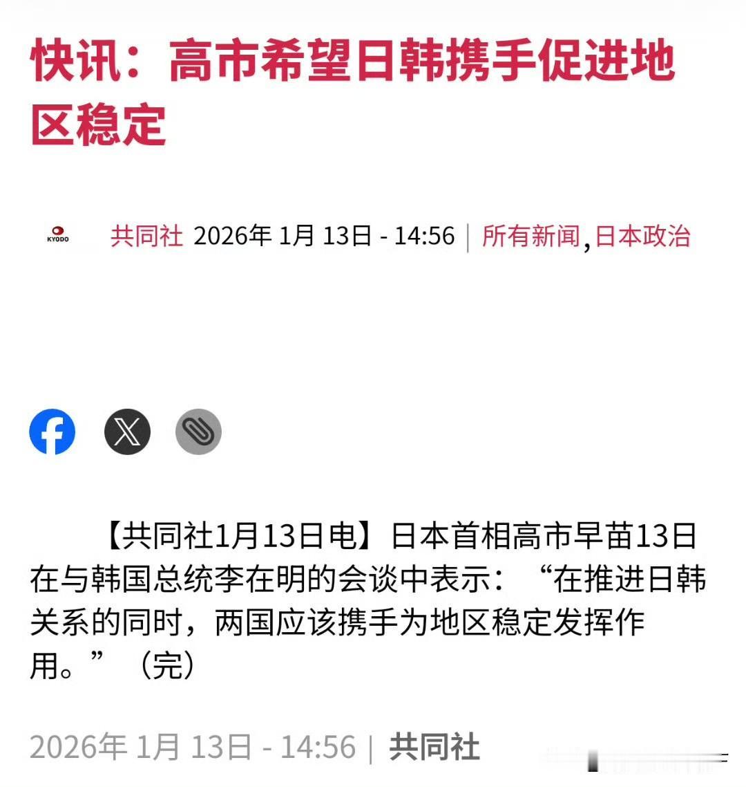 果然不出所料,李在明的话白说了,高市早苗执意要拖韩国下水 1月12日在李在明访问日本前,特地有言在先,不会介入中日矛盾,韩国坚持一个中国的原则。 在1 月13日,李在明抵达日本之后,用低对抗高务实的方式想高市进行沟通,称虽然日本和韩国有着痛苦的战争历史,但是日韩已经建交60年,双方要做的应该是管理坏的一面,发扬好的一面。务实的合作有利于在混乱的国际秩序中,站稳脚步。 李在明的这番话非常的高明,向韩国民众传达了,他没有忘却韩国曾经被日本殖民的历史,同时也向大家解释了,和日本加强经济合作的原因。 但是高市早苗一句话却暴露了她的真实目的,他想在加强日韩经济合作的同时,希望日韩携手促进地区稳定。吓得李在明不敢搭腔,而是将话题扯了回来强调韩日关系。 对于这件事情,我们怎么看呢?高市已经彻底的困在了极右翼思想里,这样的日本是非常危险的事情,所以对于日本我们必须要去军事化。对于韩国只要这不伤害中方的利益。我们无需管太多