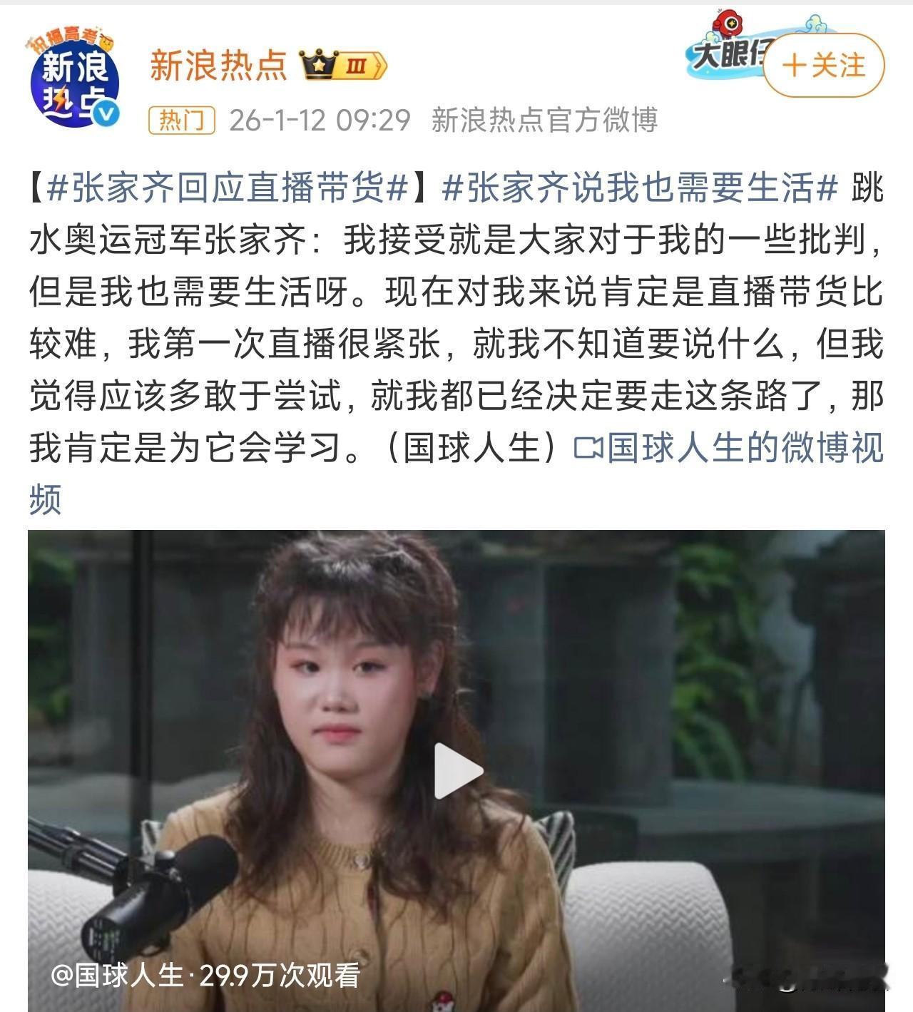 跳水奥运冠军张家齐直播带货,这算什么大不了的事?小姑娘说得很好,世界冠军,又不能当饭吃,还是要挣钱生活啊! 趁着年轻多挣点钱,没啥的!