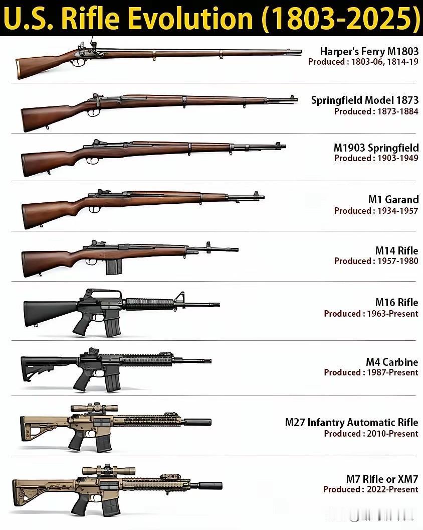 从1803年哈珀斯费里M1803前膛枪列装美军,到2022年XM7(M7)模块化步枪正式服役,两百余年里,美国军用步枪的发展轨迹,恰恰是单兵武器技术迭代的鲜活缩影。 19世纪到20世纪初,栓动步枪撑起了美军单兵火力的核心。斯普林菲尔德1873型完成了从前膛装填到后膛装填的关键跨越,而M1903斯普林菲尔德借鉴毛瑟枪机设计,成了两次世界大战里美军的经典装备。1934年M1加兰德的问世堪称里程碑,这款半自动步枪用8发漏夹供弹,让美军第一次在单兵火力上甩开了使用栓动步枪的对手。 战后的步枪发展朝着自动化、小口径一路走。M14自动步枪因7.62毫米弹药后坐力过大逐渐淡出,M16则以5.56毫米小口径开启了突击步枪的时代,它的短管版M4卡宾枪至今仍是美军的主力装备。2010年后,M27 IAR把步枪的精准度和轻机枪的持续火力结合起来,而XM7(M7)换上6.8毫米先进弹药,搭配模块化设计,为现代战场打造出了更具杀伤力与适配性的新一代单兵武器。两百年间,美国步枪始终跟着战场需求走,在轻量化、精准化、模块化的道路上不断摸索前进。 军事 军迷发烧友 武器装备 轻武器 步枪发展史 美军新型步枪 m14自动步枪 模块化枪支