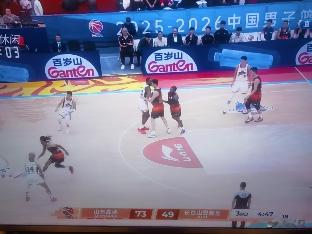 换频道了,不看了!一场没有任何悬念的比赛,山东高速男篮七连胜板上钉钉!刚刚山东高速男篮主场迎战吉林长白山男篮,三节结束,山东高速男篮82:54大比分领先,已经没有了任何悬念!吉林东北虎今年成绩应该说是还可以,特别是盖利和縻尔的加盟,为吉林东北虎增加了实力,但是吉林东北虎卖走了几名本土有实力球员,让这支往年带有黑马性质的球队又回归了平民的本色!特别是相当年吉林双子星座姜伟泽,姜宇星,姜宇星去了辽宁男篮星,如今吉林长白山虎威已不再!真的看不明白,这么好的球员,为什么要转会给别的俱乐部