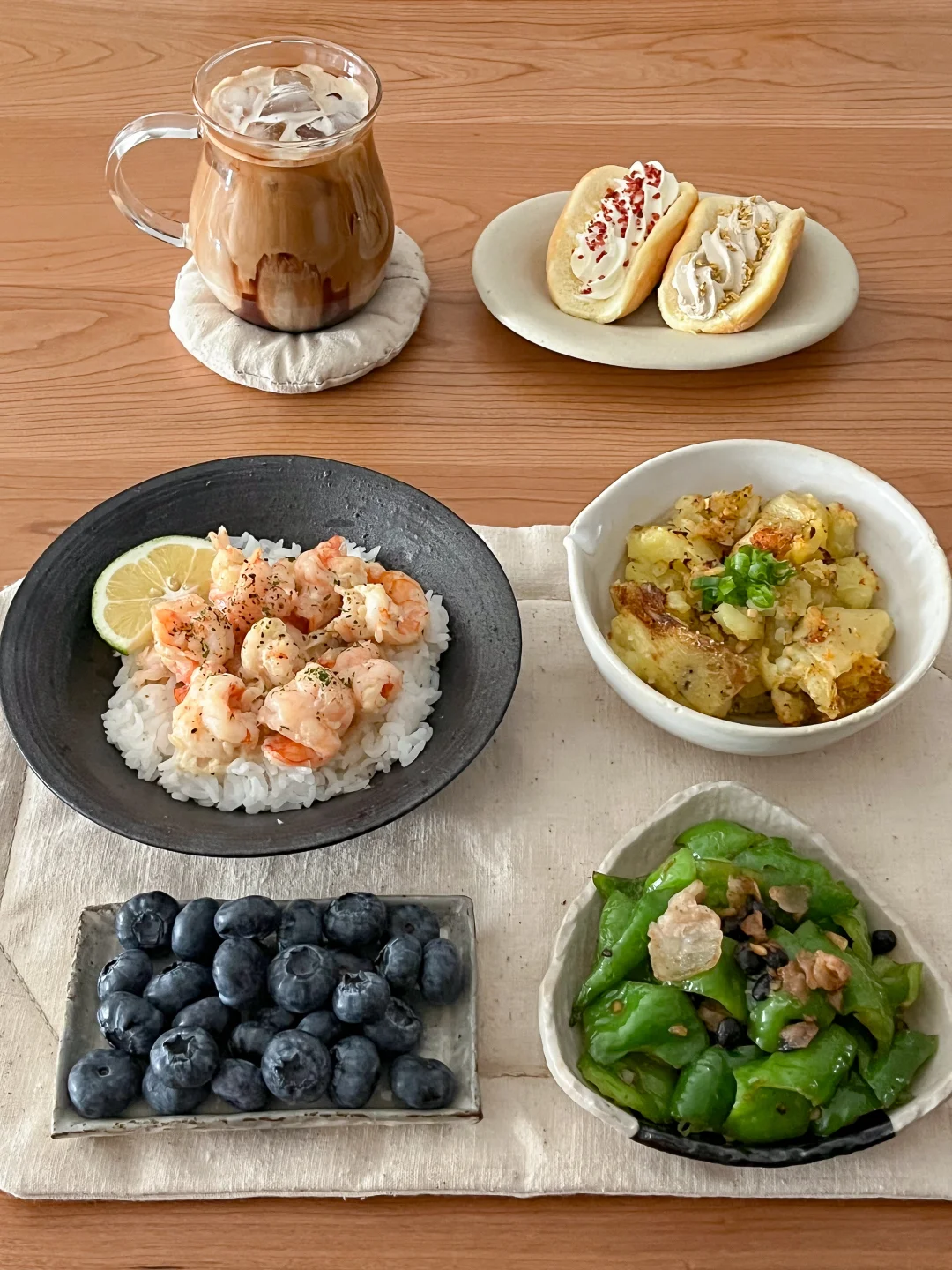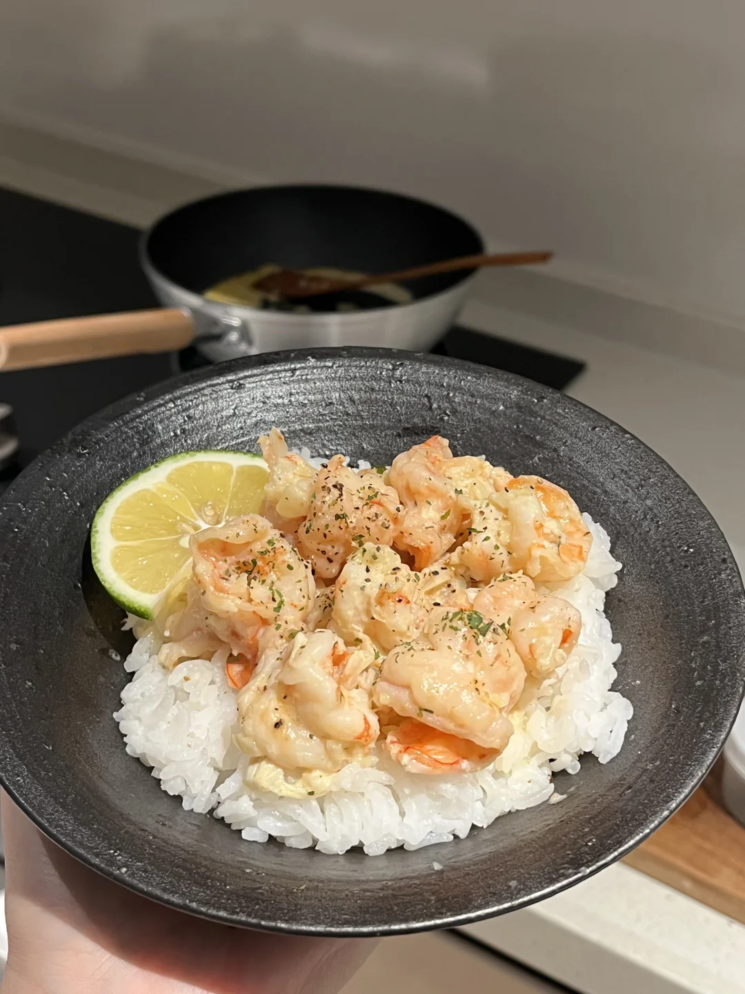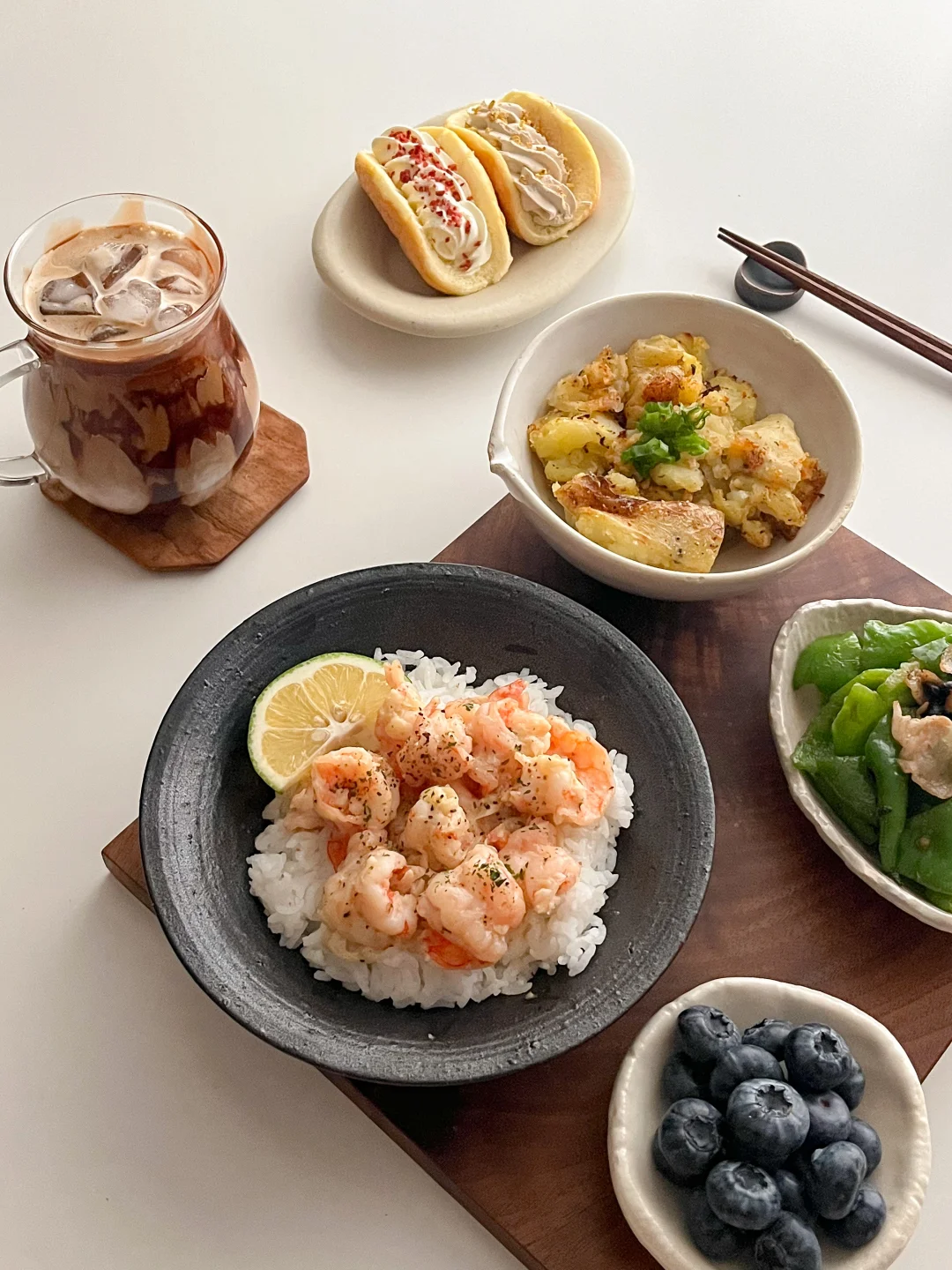 2026新年第一餐 依然是我爱的奶油虾仁 虾仁提前对半开背不切断 撒点海盐和胡椒粒更入味 大虾卷成饱满的弧度 刚好都变胖嘟嘟的 奶油虾仁饭🍤 椒盐小土豆🥔 豆豉青椒小炒肉🫑 咸奶油抱抱卷🧁 巧克力酱拿铁☕️