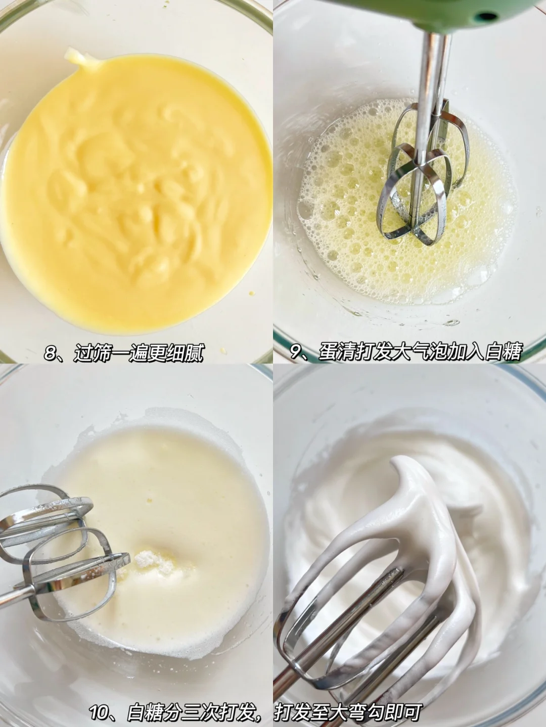 2、蛋清打发先高速再低速打发至出现大弯钩即可,不要打过哦否则做出来的会不够柔软,糖分三次加入
